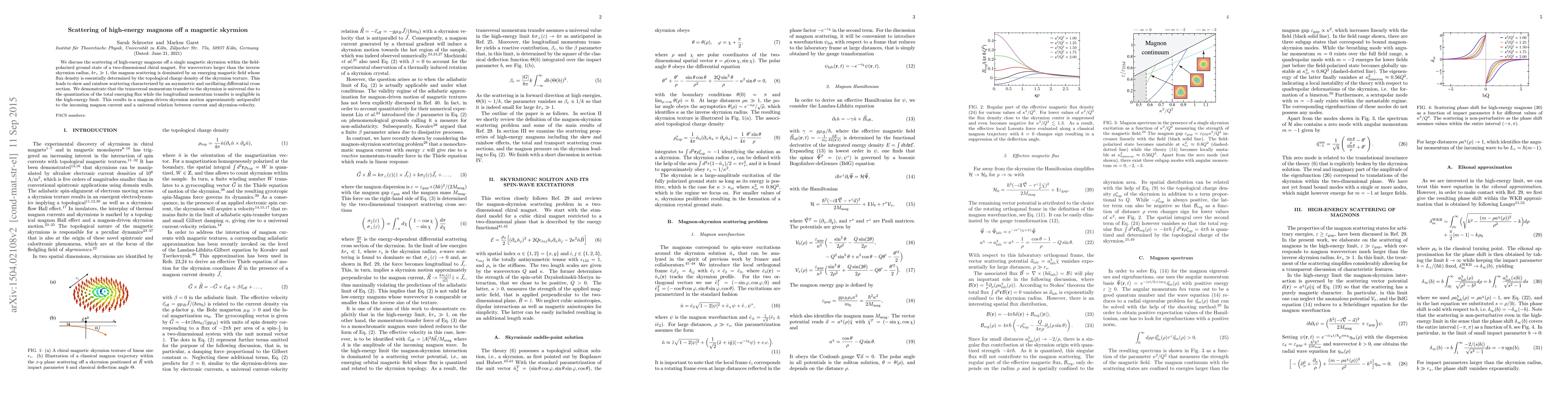We discuss the scattering of high-energy magnons off a single magnetic skyrmion within the field-polarized ground state of a two-dimensional chiral magnet. For wavevectors larger than the inverse skyrmion radius, $k r_s \gg 1$, the magnon scattering is dominated by an emerging magnetic field whose flux density is essentially determined by the topological charge density of the skyrmion texture. This leads to skew and rainbow scattering characterized by an asymmetric and oscillating differential cross section. We demonstrate that the transversal momentum transfer to the skyrmion is universal due to the quantization of the total emerging flux while the longitudinal momentum transfer is negligible in the high-energy limit. This results in a magnon-driven skyrmion motion approximately antiparallel to the incoming magnon current and a universal relation between current and skyrmion-velocity.