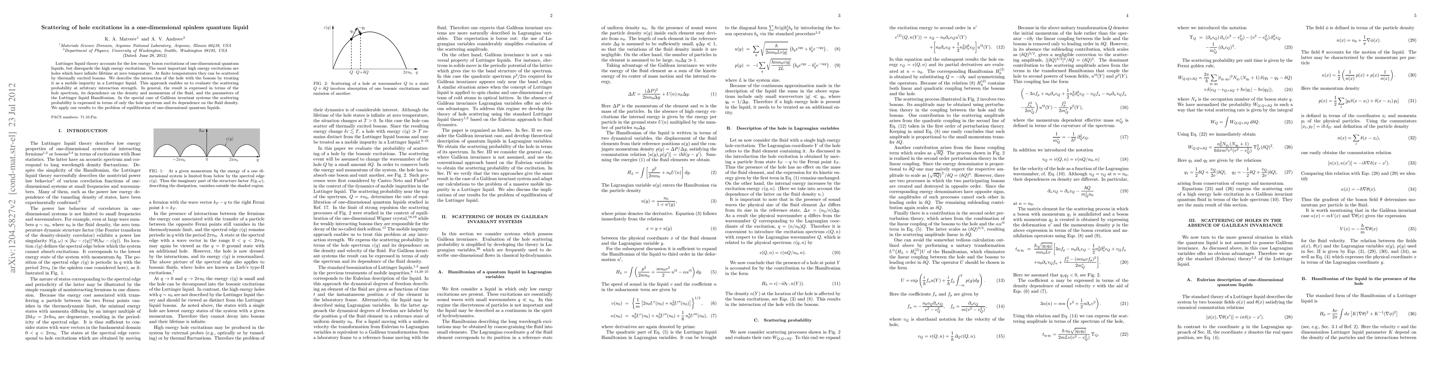 This paper explores the scattering of hole excitations in one-dimensional spinless quantum liquids using Luttinger liquid theory, treating holes as mobile impurities. It evaluates scattering probabilities at various interaction strengths and applies the findings to understand equilibration in these quantum liquids.