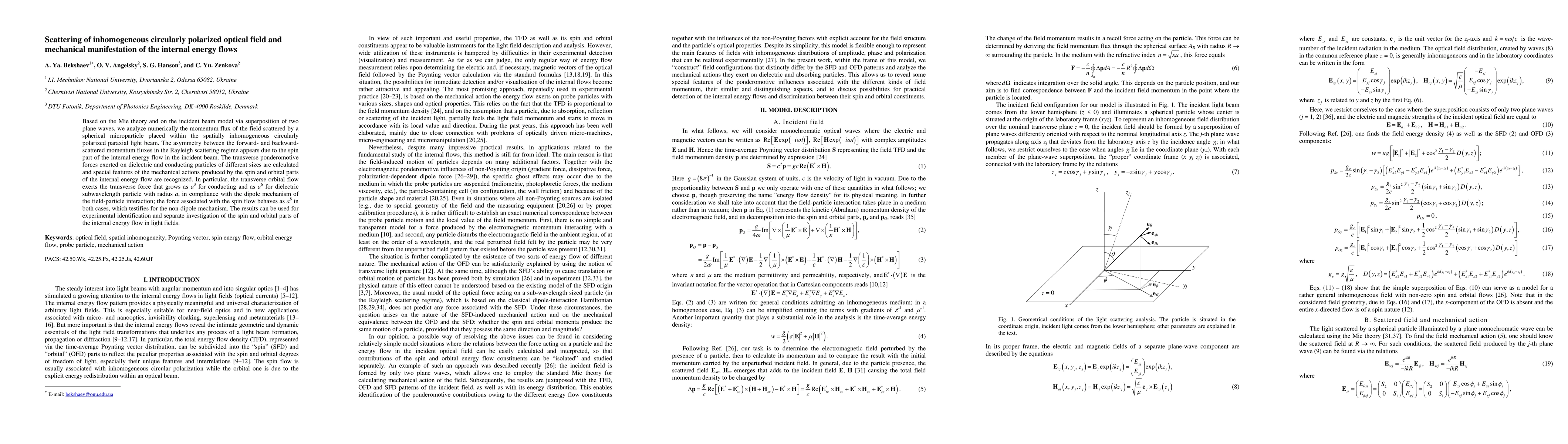 This paper numerically analyzes the scattering of inhomogeneous circularly polarized light by spherical microparticles, revealing asymmetry in momentum flux due to the spin part of the internal energy flow. It identifies distinct mechanical actions from the spin and orbital parts, with the orbital flow exerting a force proportional to a^3 for conductors and a^6 for dielectrics, while the spin flow follows a non-dipole mechanism with a^8 dependence.