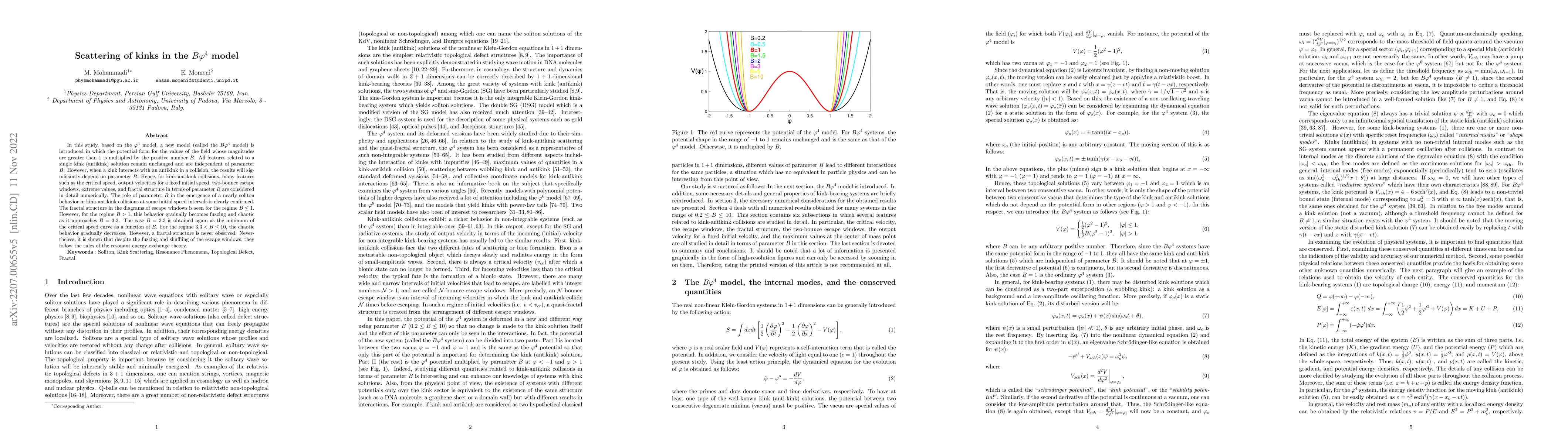 In this study, based on the $\varphi^4$ model, a new model (called the $B\varphi^4$ model) is introduced in which the potential form for the values of the field whose magnitudes are greater than $1$ is multiplied by the positive number $B$. All features related to a single kink (antikink) solution remain unchanged and are independent of parameter $B$. However, when a kink interacts with an antikink in a collision, the results will significantly depend on parameter $B$. Hence, for kink-antikink collisions, many features such as the critical speed, output velocities for a fixed initial speed, two-bounce escape windows, extreme values, and fractal structure in terms of parameter $B$ are considered in detail numerically. The role of parameter $B$ in the emergence of a nearly soliton behavior in kink-antikink collisions at some initial speed intervals is clearly confirmed. The fractal structure in the diagrams of escape windows is seen for the regime $B\leq 1$. However, for the regime $B >1$, this behavior gradually becomes fuzzing and chaotic as it approaches $B = 3.3$. The case $B = 3.3$ is obtained again as the minimum of the critical speed curve as a function of $B$. For the regime $3.3< B \leq 10$, the chaotic behavior gradually decreases. However, a fractal structure is never observed. Nevertheless, it is shown that despite the fuzzing and shuffling of the escape windows, they follow the rules of the resonant energy exchange theory.