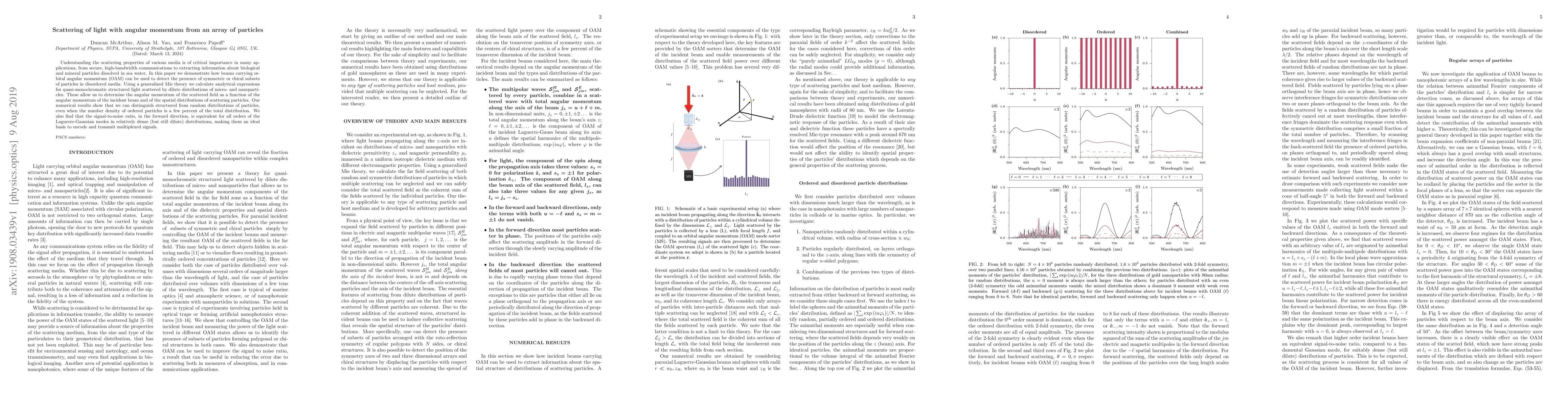 Understanding the scattering properties of various media is of critical importance in many applications, from secure, high-bandwidth communications to extracting information about biological and mineral particles dissolved in sea water. In this paper we demonstrate how beams carrying orbital angular momentum (OAM) can be used to detect the presence of symmetric or chiral subsets of particles in disordered media. Using a generalized Mie theory we calculate analytical expressions for quasi-monochromatic structured light scattered by dilute distributions of micro- and nanoparticles. These allow us to determine the angular momentum of the scattered field as a function of the angular momentum of the incident beam and of the spatial distributions of scattering particles. Our numerical results show that we can distinguish structured from random distributions of particles, even when the number density of ordered particles is a few percent of the total distribution. We also find that the signal-to-noise ratio, in the forward direction, is equivalent for all orders of the Laguerre-Gaussian modes in relatively dense (but still dilute) distributions, making them an ideal basis to encode and transmit multiplexed signals.