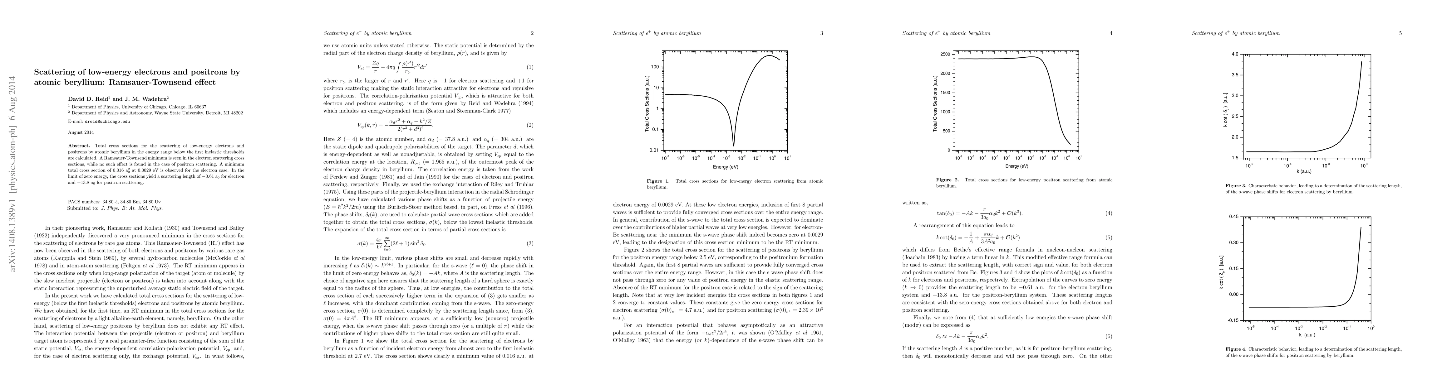 This paper calculates the total cross sections for low-energy electron and positron scattering by atomic beryllium, revealing a Ramsauer-Townsend minimum in electron scattering but not in positron scattering. The electron scattering exhibits a minimum cross section of 0.016 a.u. at 0.0029 eV.
