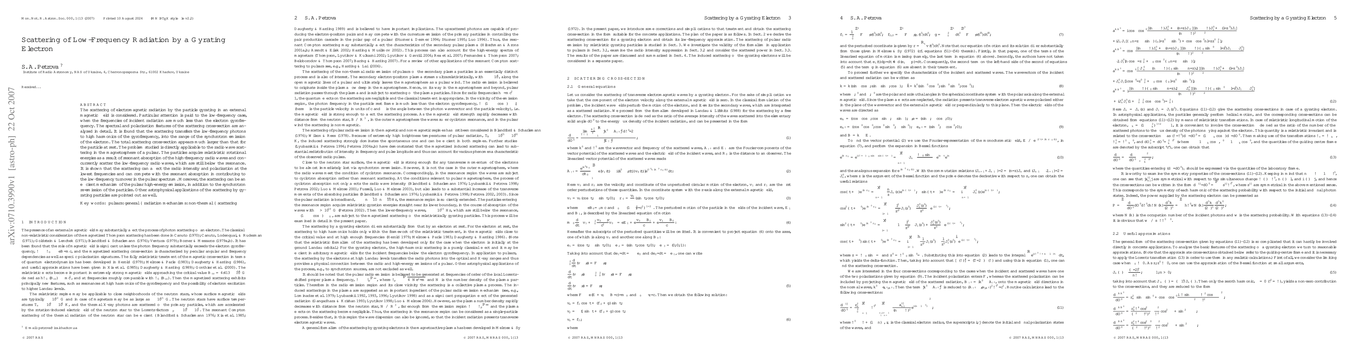 Research shows that low-frequency radiation can scatter off a gyrating electron in an external magnetic field, transferring energy to high harmonics of the gyrofrequency and affecting radio intensity and polarization at low frequencies.