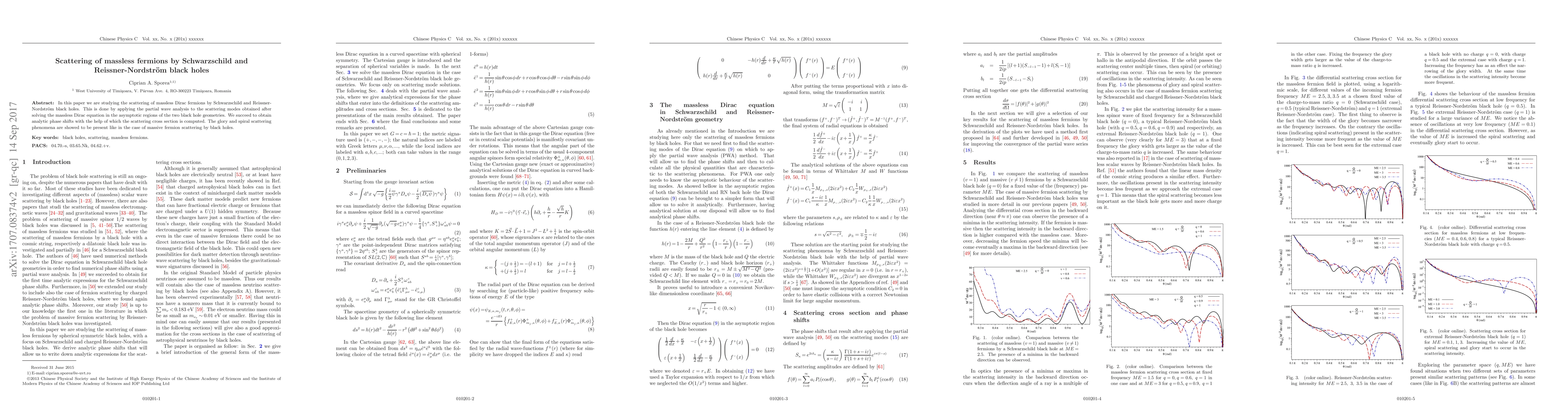 This paper investigates the scattering of massless Dirac fermions by Schwarzschild and Reissner-Nordström black holes using partial wave analysis and the massless Dirac equation. Analytic phase shifts are derived, leading to the computation of scattering cross sections and the identification of glory and spiral scattering phenomena.