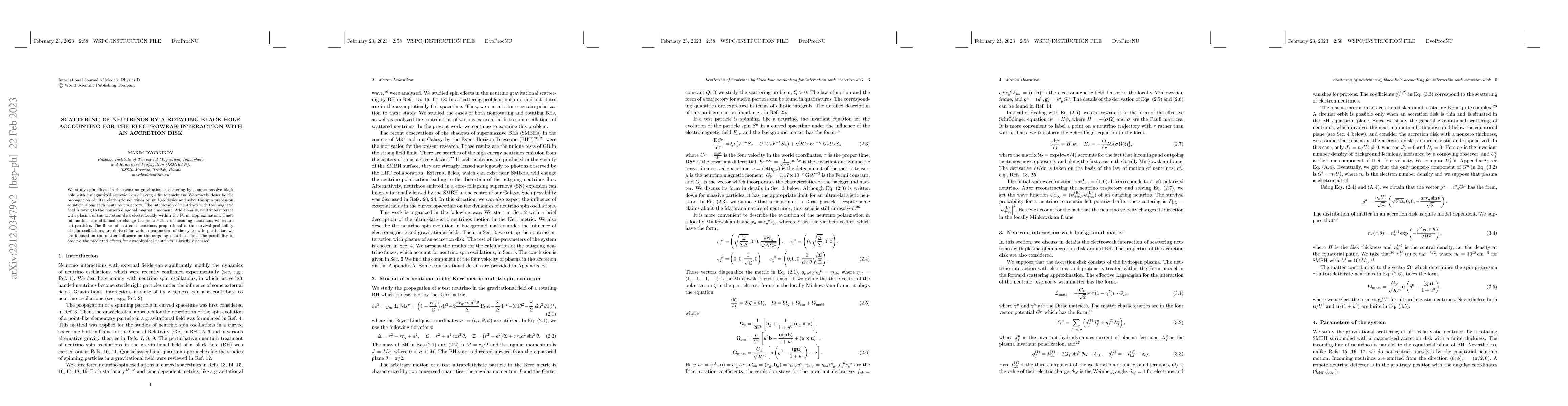 This paper investigates the gravitational scattering of neutrinos by a rotating black hole, considering both gravitational and electroweak interactions with a magnetized accretion disk. The study focuses on how spin effects and magnetic field interactions influence the polarization and flux of scattered neutrinos, with implications for potential astrophysical observations.