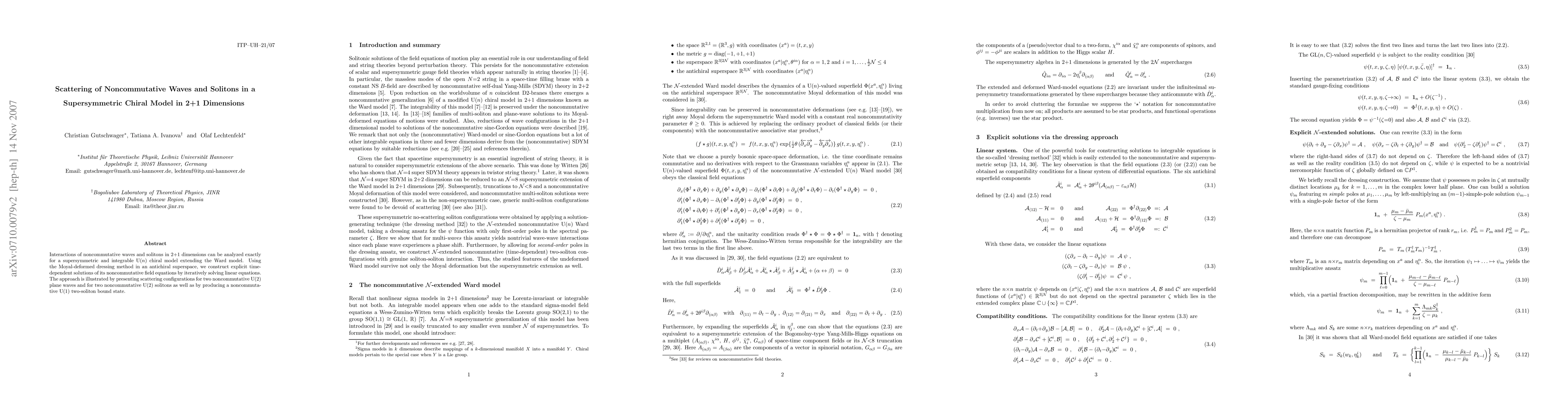 Interactions of noncommutative waves and solitons in 2+1 dimensions can be analyzed exactly for a supersymmetric and integrable U(n) chiral model extending the Ward model. Using the Moyal-deformed dressing method in an antichiral superspace, we construct explicit time-dependent solutions of its noncommutative field equations by iteratively solving linear equations. The approach is illustrated by presenting scattering configurations for two noncommutative U(2) plane waves and for two noncommutative U(2) solitons as well as by producing a noncommutative U(1) two-soliton bound state.