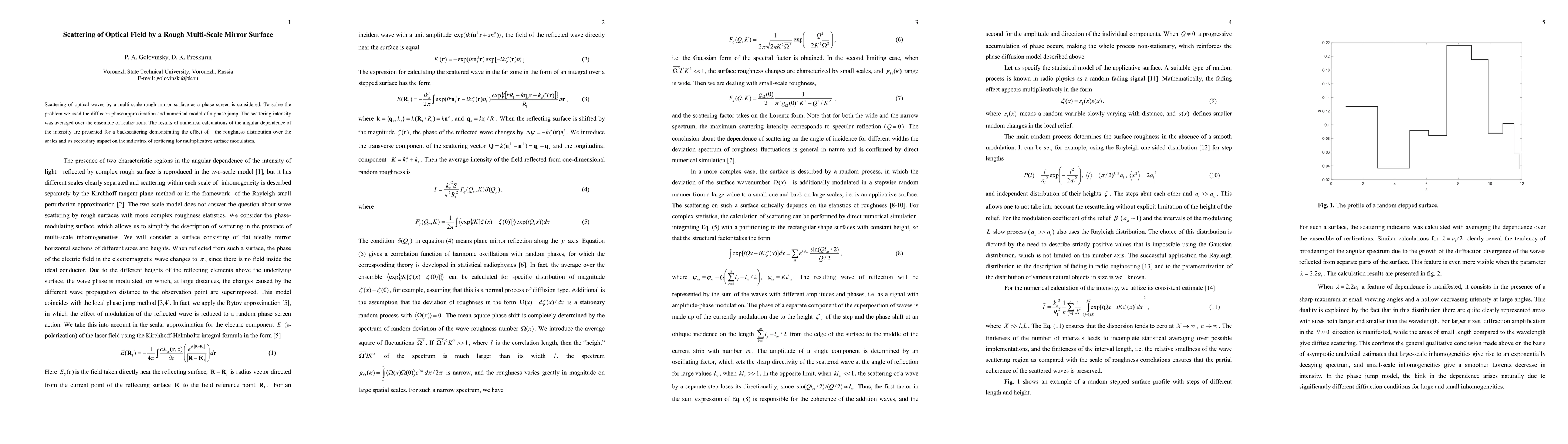 Scattering of optical waves by a multi-scale rough mirror surface as a phase screen is considered. To solve the problem we used the diffusion phase approximation and numerical model of a phase jump. The scattering intensity was averaged over the ensemble of realizations. The results of numerical calculations of the angular dependence of the intensity are presented for a backscattering demonstrating the effect of the roughness distribution over the scales and its secondary impact on the indicatrix of scattering for multiplicative surface modulation.