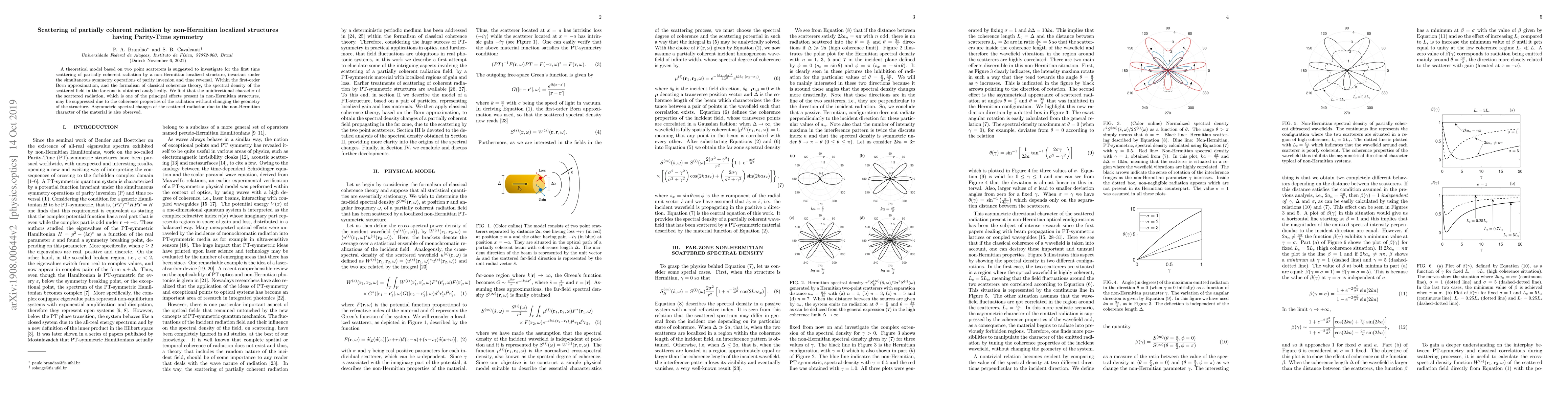 A theoretical model based on two-point scatterers is suggested to investigate scattering of partially coherent radiation by a non-Hermitian localized structure, invariant under the simultaneous symmetry operations of parity inversion and time reversal. Within the first-order Born approximation, and the formalism of classical coherence theory, the spectral density of the scattered field in the far zone is obtained analytically. We find that the unidirectional character of the scattered radiation, which is one of the principal effects present in non-Hermitian structures, may be suppressed due to the coherence properties of the radiation without changing the geometry of the structure. Asymmetric spectral changes of the scattered radiation due to the non-Hermitian character of the material are also observed.