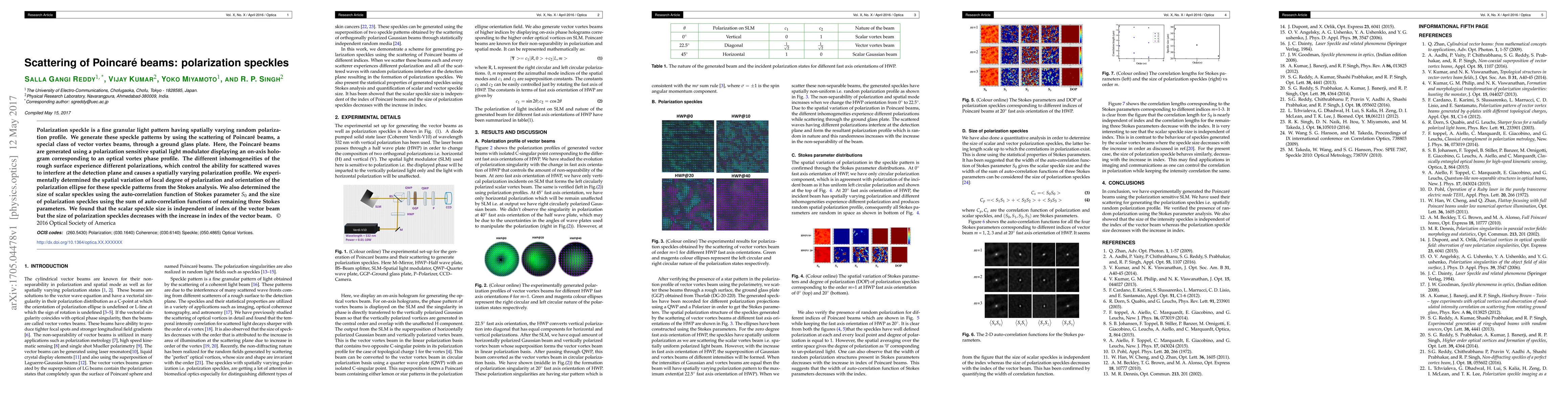 Polarization speckle is a fine granular light pattern having spatially varying random polarization profile. We generate these speckle patterns by using the scattering of Poincar\'e beams, a special class of vector vortex beams, through a ground glass plate. Here, the Poincar\'e beams are generated using a polarization sensitive spatial light modulator displaying an on-axis hologram corresponding to an optical vortex phase profile. The different inhomogeneities of the rough surface experience different polarizations, which control the ability for scattered waves to interfere at the detection plane and causes a spatially varying polarization profile. We experimentally determined the spatial variation of local degree of polarization and orientation of the polarization ellipse for these speckle patterns from the Stokes analysis. We also determined the size of scalar speckles using the auto-correlation function of Stokes parameter S0 and the size of polarization speckles using the sum of auto-correlation functions of remaining three Stokes parameters. We found that the scalar speckle size is independent of index of the vector beam but the size of polarization speckles decreases with the increase in index of the vector beam.