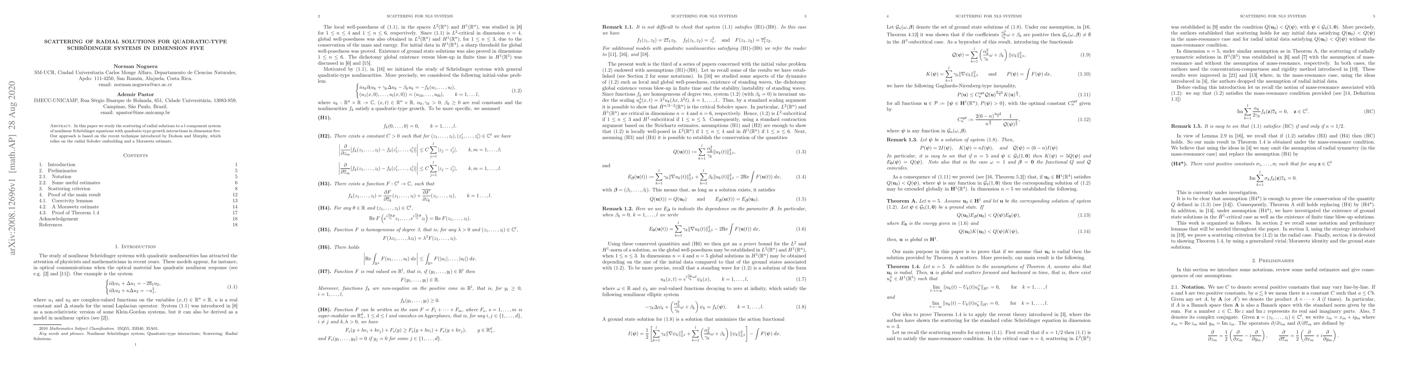 This paper studies the scattering of radial solutions to nonlinear Schr"{o}dinger equations in dimension five with quadratic-type growth interactions. It uses a new technique that relies on the radial Sobolev embedding and Morawetz estimate to make key findings about scattering behavior.