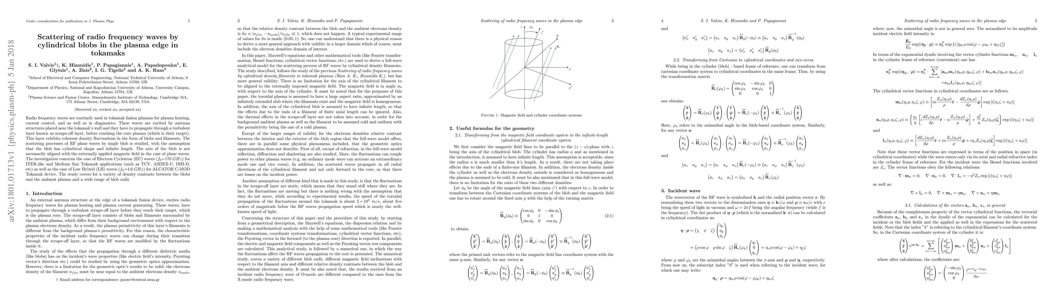Researchers studied how radio frequency waves interact with cylindrical blobs in a plasma edge in tokamaks, finding key scattering processes for two types of waves used in fusion research.