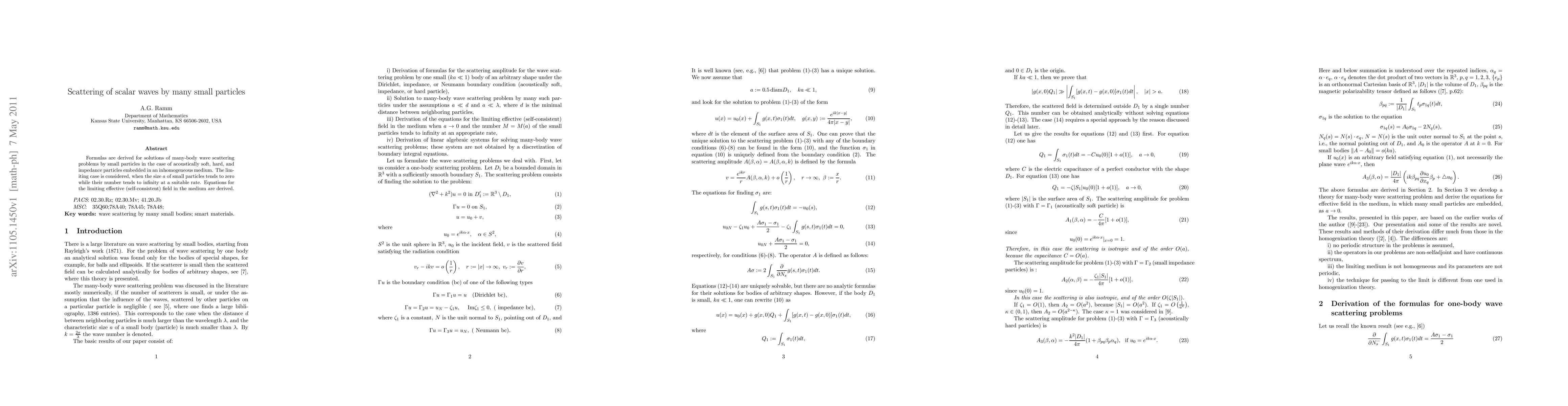 Formulas are derived for solutions of many-body wave scattering problems by small particles in the case of acoustically soft, hard, and impedance particles embedded in an inhomogeneous medium. The limiting case is considered, when the size $a$ of small particles tends to zero while their number tends to infinity at a suitable rate. Equations for the limiting effective (self-consistent) field in the medium are derived.