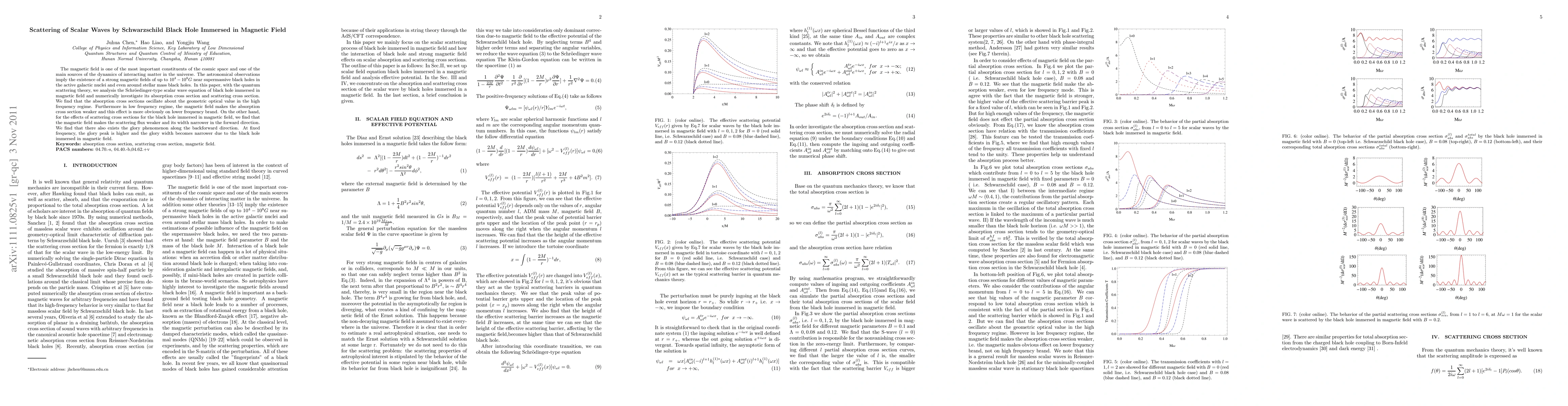 This paper analyzes the scattering of scalar waves by a Schwarzschild black hole in a magnetic field, finding that the magnetic field weakens absorption at lower frequencies and narrows scattering flux. The study also reveals oscillations in absorption cross sections at high frequencies and a glory phenomenon with enhanced peaks and narrower widths.