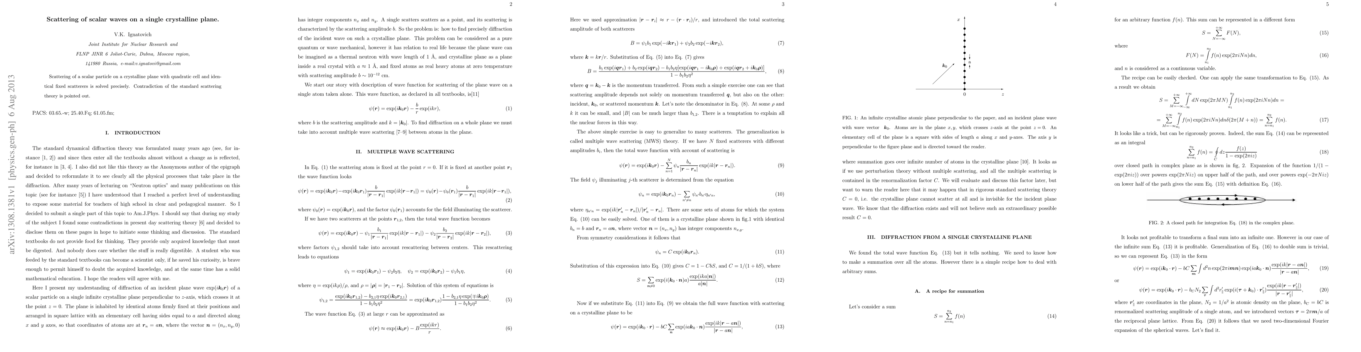 Summary: This paper precisely solves the scattering of scalar waves on a single crystalline plane, revealing a contradiction to standard scattering theory and highlighting unique scattering behaviors due to the plane's structure.