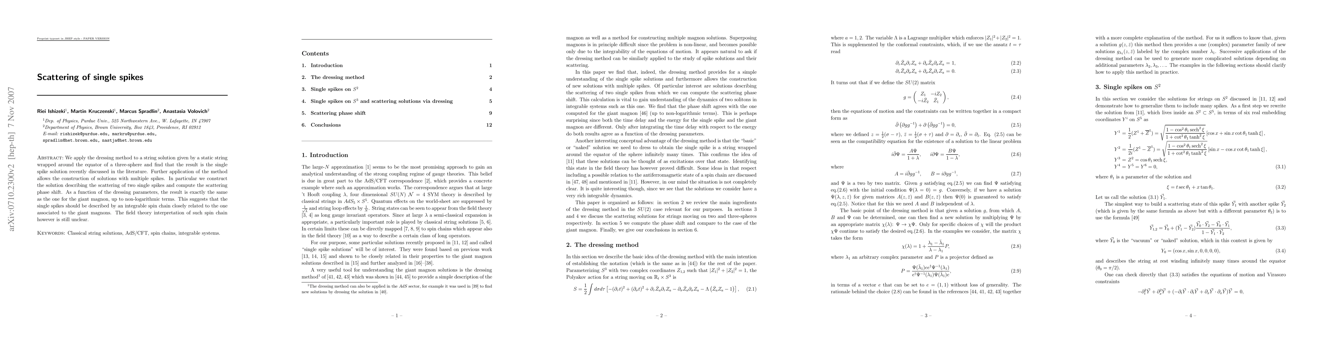 We apply the dressing method to a string solution given by a static string wrapped around the equator of a three-sphere and find that the result is the single spike solution recently discussed in the literature. Further application of the method allows the construction of solutions with multiple spikes. In particular we construct the solution describing the scattering of two single spikes and compute the scattering phase shift. As a function of the dressing parameters, the result is exactly the same as the one for the giant magnon, up to non-logarithmic terms. This suggests that the single spikes should be described by an integrable spin chain closely related to the one associated to the giant magnons. The field theory interpretation of such spin chain however is still unclear.