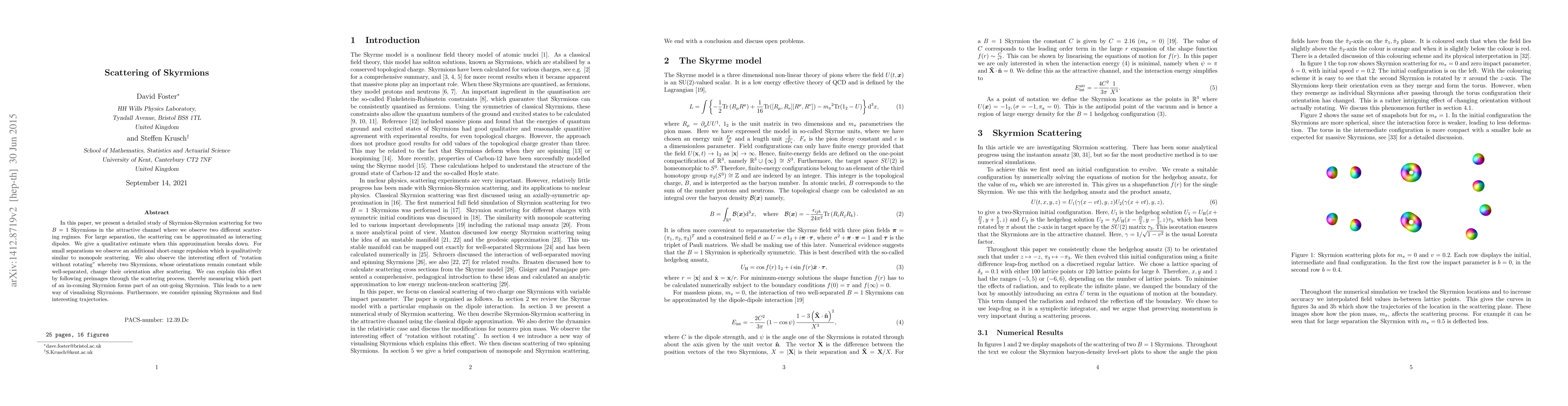 Researchers studied Skyrmion scattering, observing two regimes: a large separation approximation as interacting dipoles and an additional short-range repulsion for small separations, with interesting effects including 'rotation without rotating'.