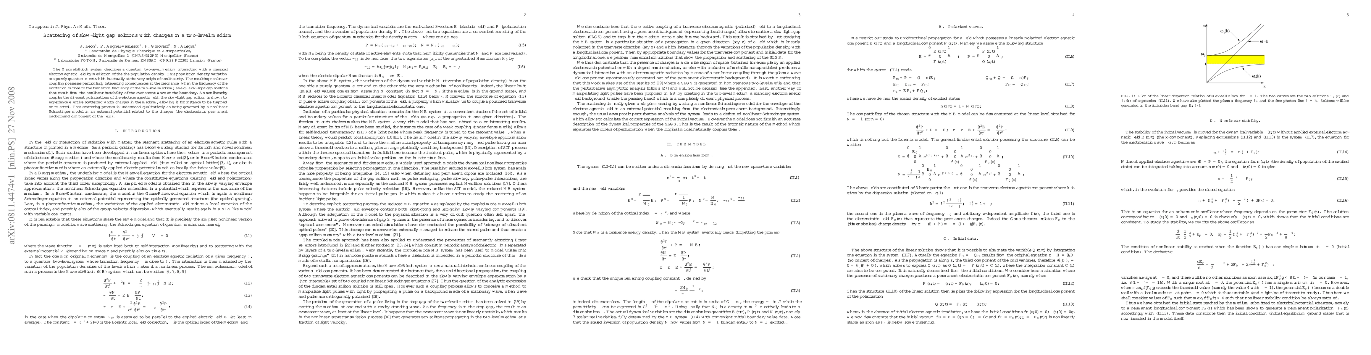The Maxwell-Bloch system describes a quantum two-level medium interacting with a classical electromagnetic field by mediation of the the population density. This population density variation is a purely quantum effect which is actually at the very origin of nonlinearity. The resulting nonlinear coupling possesses particularly interesting consequences at the resonance (when the frequency of the excitation is close to the transition frequency of the two-level medium) as e.g. slow-light gap solitons that result from the nonlinear instability of the evanescent wave at the boundary. As nonlinearity couples the different polarizations of the electromagnetic field, the slow-light gap soliton is shown to experience effective scattering whith charges in the medium, allowing it for instance to be trapped or reflected. This scattering process is understood qualitatively as being governed by a nonlinear Schroedinger model in an external potential related to the charges (the electrostatic permanent background component of the field).