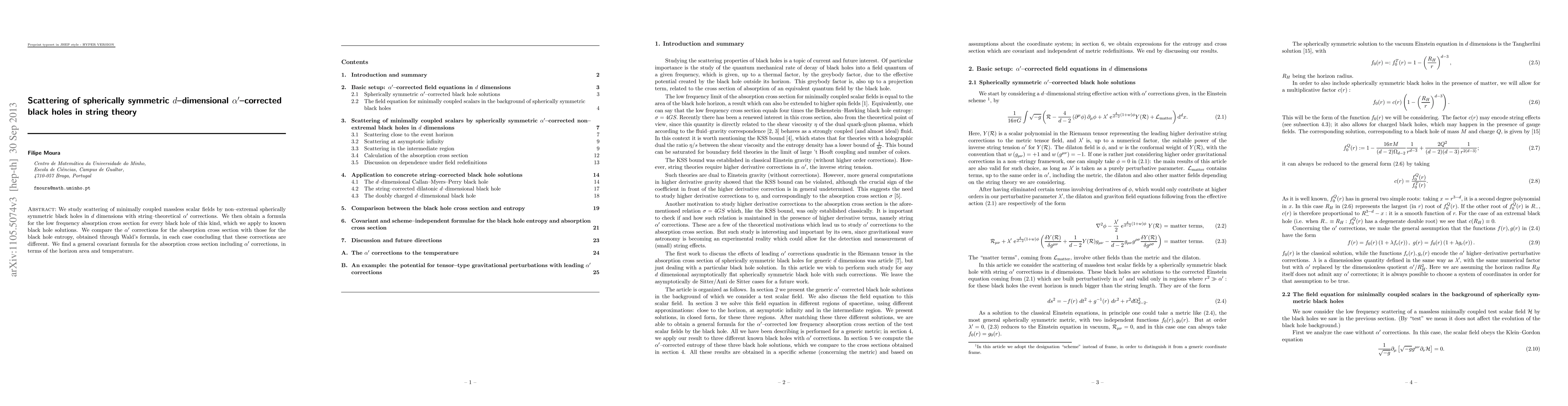 This paper investigates the scattering of massless scalar fields by d-dimensional alpha'-corrected black holes, deriving a low-frequency absorption cross section formula that differs from entropy corrections. It concludes with a covariant expression for the absorption cross section involving alpha' corrections, horizon area, and temperature.