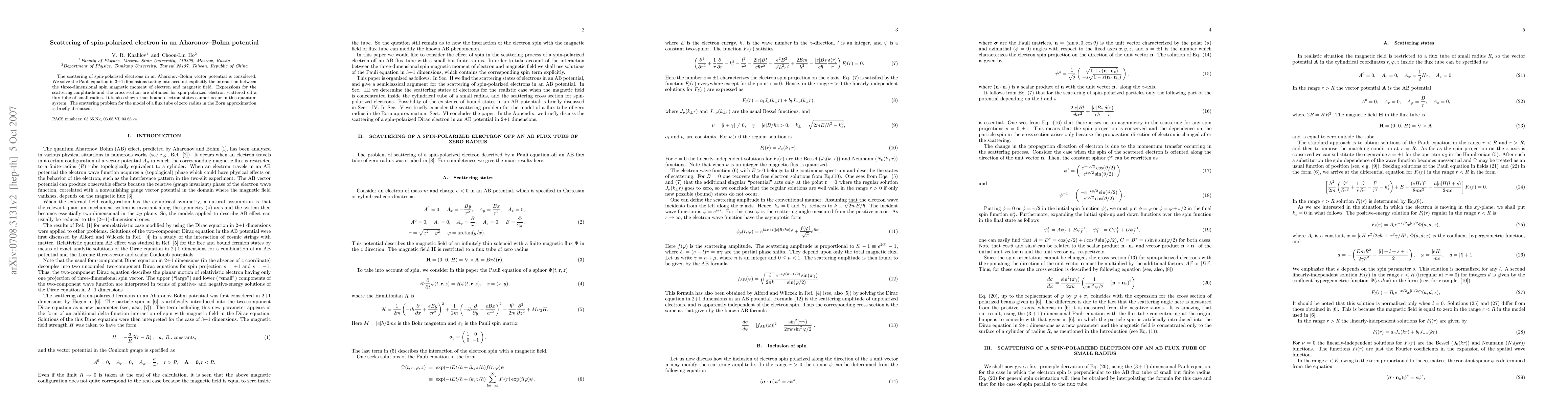 This study examines the scattering of spin-polarized electrons in an Aharonov-Bohm potential, solving the Pauli equation to derive expressions for scattering amplitude and cross section. It concludes that no bound electron states can exist in this quantum system and briefly discusses the scattering in the Born approximation for a zero-radius flux tube.