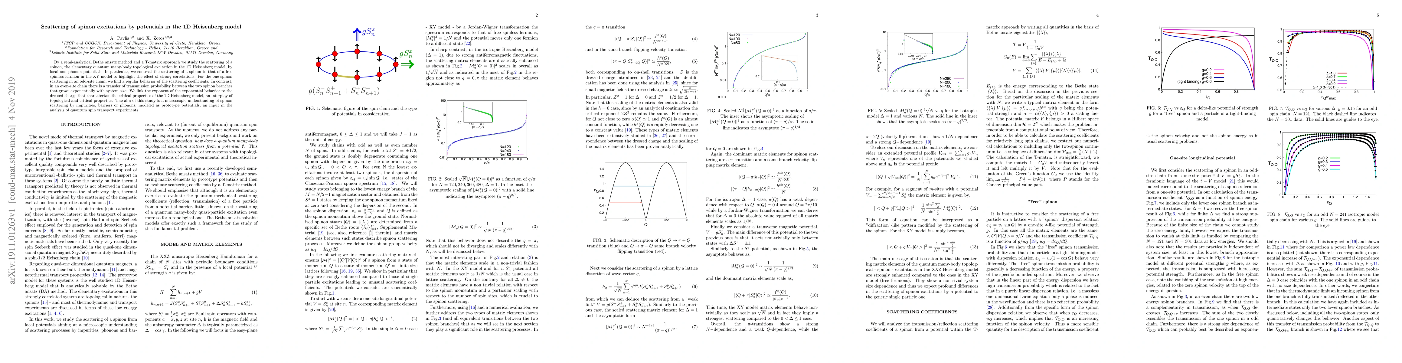 By a semi-analytical Bethe ansatz method and a T-matrix approach we study the scattering of a spinon, the elementary quantum many-body topological excitation in the 1D Heisenberg model, by local and phonon potentials. In particular, we contrast the scattering of a spinon to that of a free spinless fermion in the XY model to highlight the effect of strong correlations. For the one spinon scattering in an odd-site chain, we find a regular behavior of the scattering coefficients. In contrast, in an even-site chain there is a transfer of transmission probability between the two spinon branches that grows exponentially with system size. We link the exponent of the exponential behavior to the dressed charge that characterizes the critical properties of the 1D Heisenberg model, an interplay of topological and critical properties. The aim of this study is a microscopic understanding of spinon scattering by impurities, barriers or phonons, modeled as prototype potentials, an input in the analysis of quantum spin transport experiments.