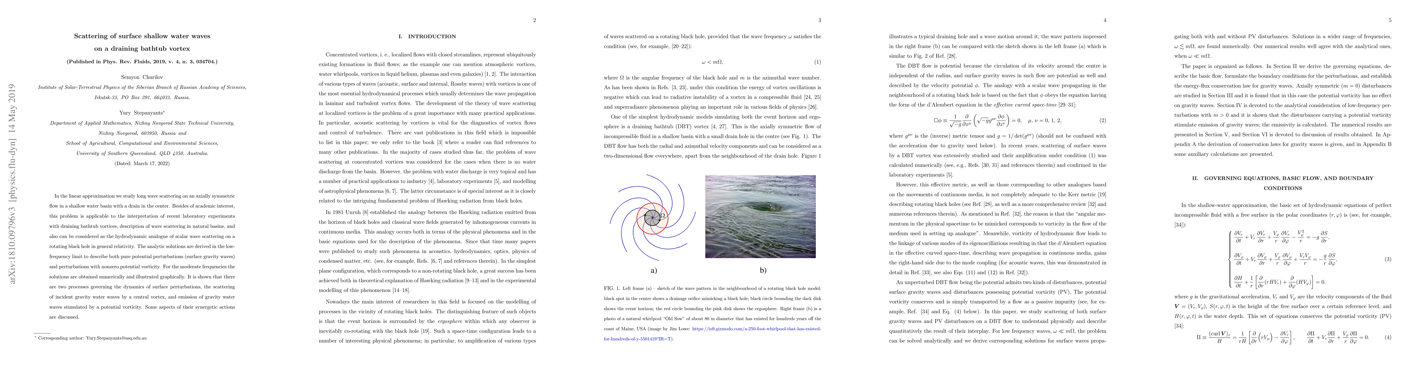 This paper studies the scattering of long surface shallow water waves on a draining bathtub vortex, deriving analytic solutions for low frequencies and numerical solutions for moderate frequencies. It reveals two key processes: wave scattering by the central vortex and wave emission stimulated by potential vorticity.