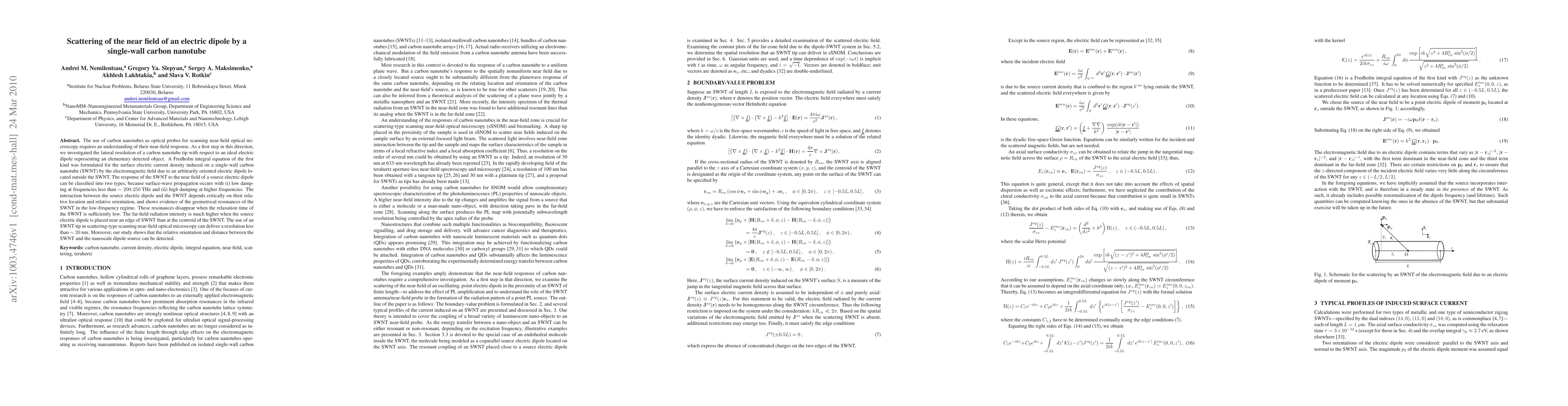 This paper investigates the scattering of an electric dipole's near field by a single-wall carbon nanotube (SWNT), revealing the SWNT's response to dipole fields and its potential for high-resolution scanning near-field optical microscopy. The study identifies two types of surface-wave propagation on the SWNT, with geometrical resonances evident at low frequencies.