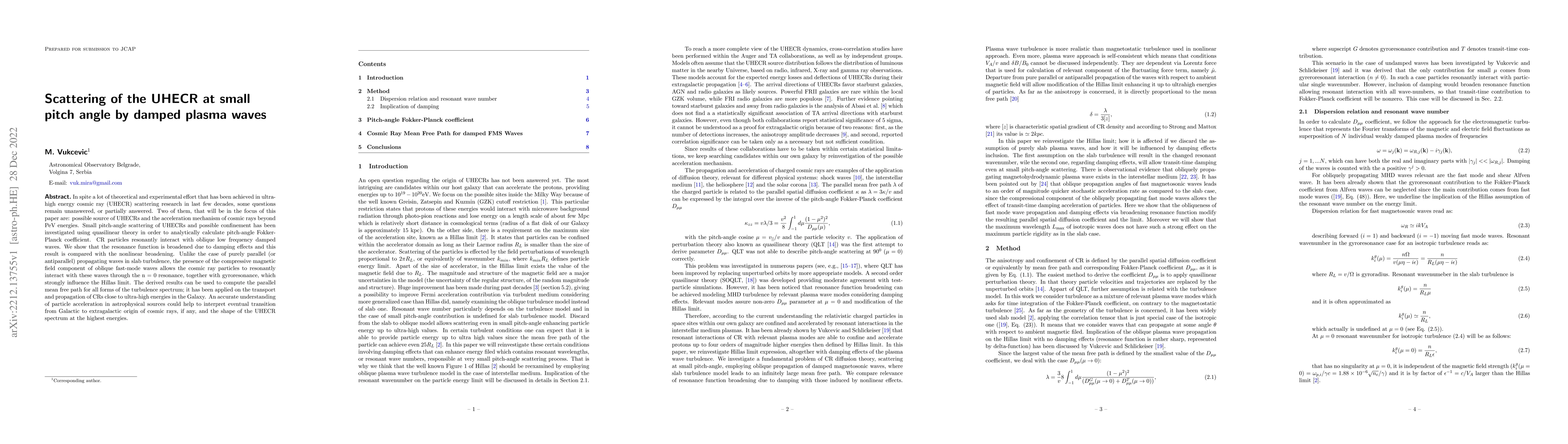This paper investigates the scattering of ultra-high energy cosmic rays (UHECRs) at small pitch angles by damped plasma waves, focusing on the acceleration mechanism and potential sources beyond PeV energies. It uses quasilinear theory to calculate pitch-angle Fokker-Planck coefficients, showing that damping broadens the resonance function and influences the Hillas limit, which impacts the parallel mean free path and cosmic ray transport in the Galaxy.