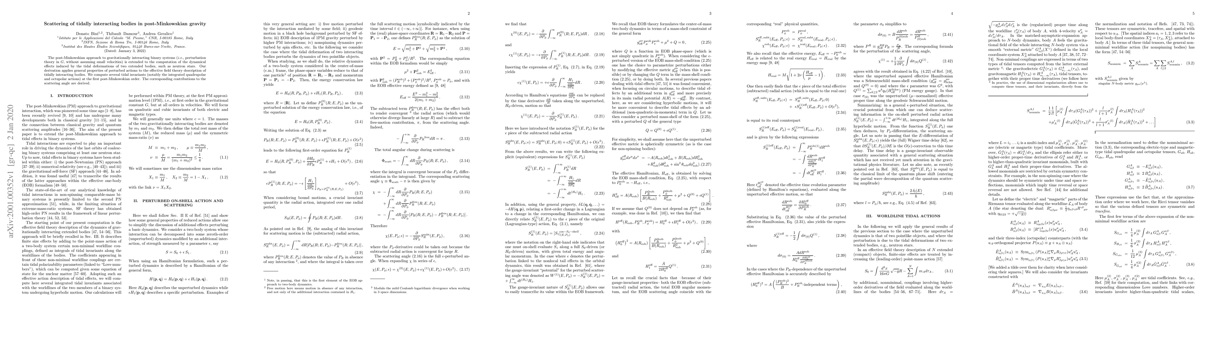 This paper extends the post-Minkowskian approach to include tidal deformations in gravitationally interacting binary systems, calculating tidal invariants and their contributions to scattering angles at the first post-Minkowskian order. The method applies general properties of perturbed actions to the effective field theory of tidally interacting bodies.