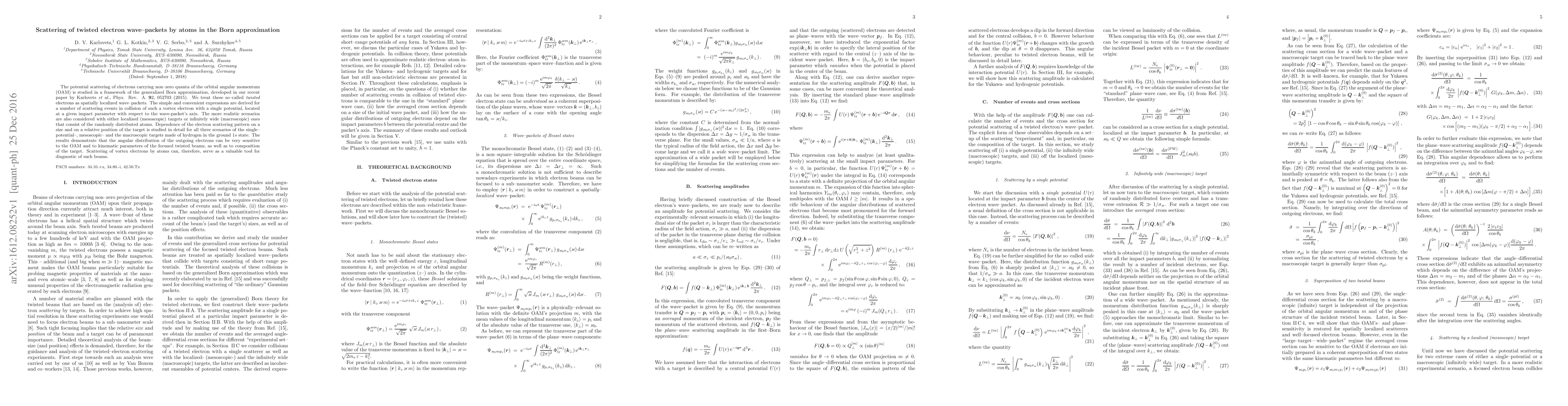 The potential scattering of electrons carrying non--zero quanta of the orbital angular momentum (OAM) is studied in a framework of the generalized Born approximation, developed in our recent paper by Karlovets \textit{et al.}, Phys. Rev. A. {\textbf 92}, 052703 (2015). We treat these so--called \textit{twisted} electrons as spatially localized wave--packets. The simple and convenient expressions are derived for a number of scattering events in collision of such a vortex electron with a single potential, located at a given impact parameter with respect to the wave-packet's axis. The more realistic scenarios are also considered with either localized (mesoscopic) targets or infinitely wide (macroscopic) ones that consist of the randomly distributed atoms. Dependence of the electron scattering pattern on a size and on a relative position of the target is studied in detail for all three scenarios of the single--potential--, mesoscopic-- and the macroscopic targets made of hydrogen in the ground $1s$ state. The results demonstrate that the angular distribution of the outgoing electrons can be very sensitive to the OAM and to kinematic parameters of the focused twisted beams, as well as to composition of the target. Scattering of vortex electrons by atoms can, therefore, serve as a valuable tool for diagnostic of such beams.