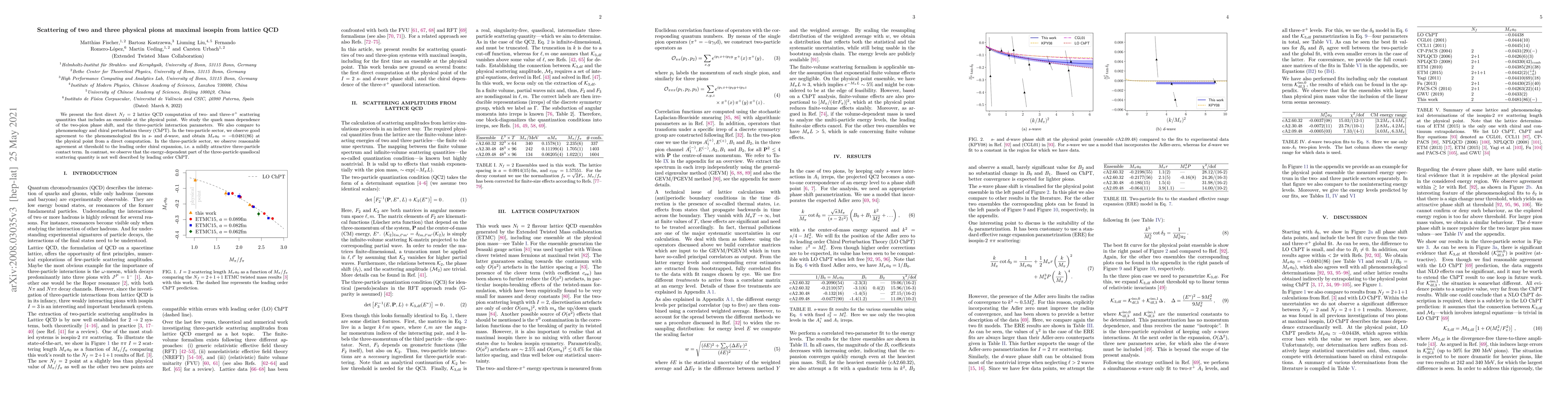 We present the first direct $N_f=2$ lattice QCD computation of two- and three-$\pi^+$ scattering quantities that includes an ensemble at the physical point. We study the quark mass dependence of the two-pion phase shift, and the three-particle interaction parameters. We also compare to phenomenology and chiral perturbation theory (ChPT). In the two-particle sector, we observe good agreement to the phenomenological fits in $s$- and $d$-wave, and obtain $M_\pi a_0 = -0.0481(86)$ at the physical point from a direct computation. In the three-particle sector, we observe reasonable agreement at threshold to the leading order chiral expansion, i.e.\@ a mildly attractive three-particle contact term. In contrast, we observe that the energy-dependent part of the three-particle quasilocal scattering quantity is not well described by leading order ChPT.