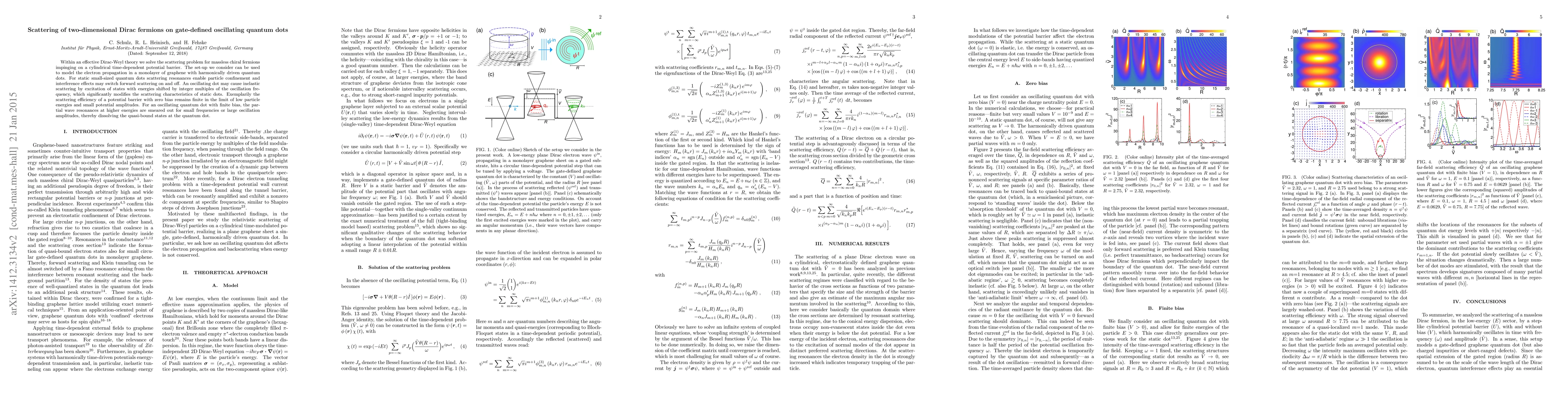 This research solves scattering of massless chiral fermions in 2D, like graphene electrons, on oscillating quantum dots. It finds that oscillating dots cause inelastic scattering, significantly altering scattering characteristics from static dots, with implications for electron confinement and interference effects.