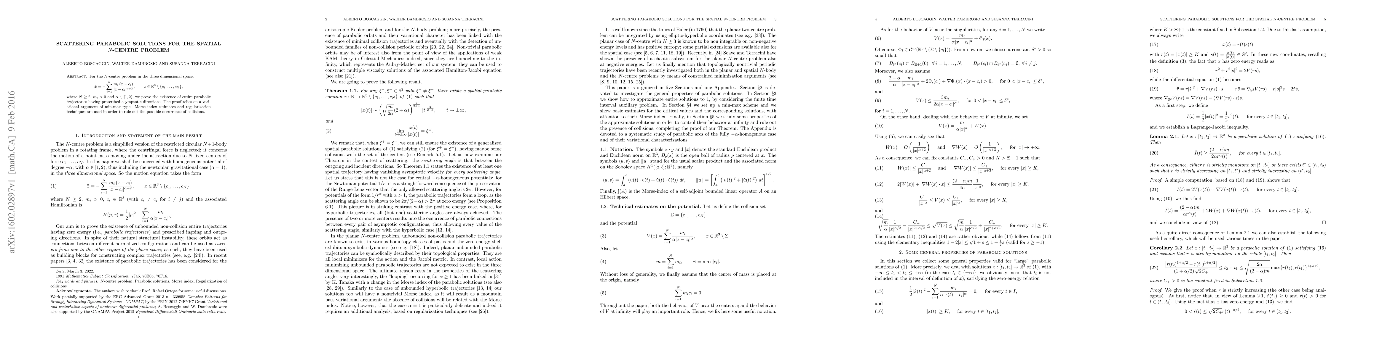 For the $N$-centre problem in the three dimensional space, $$ \ddot x = -\sum_{i=1}^{N} \frac{m_i \,(x-c_i)}{\vert x - c_i \vert^{\alpha+2}}, \qquad x \in \mathbb{R}^3 \setminus \{c_1,\ldots,c_N\}, $$ where $N \geq 2$, $m_i > 0$ and $\alpha \in [1,2)$, we prove the existence of entire parabolic trajectories having prescribed asymptotic directions. The proof relies on a variational argument of min-max type. Morse index estimates and regularization techniques are used in order to rule out the possible occurrence of collisions.