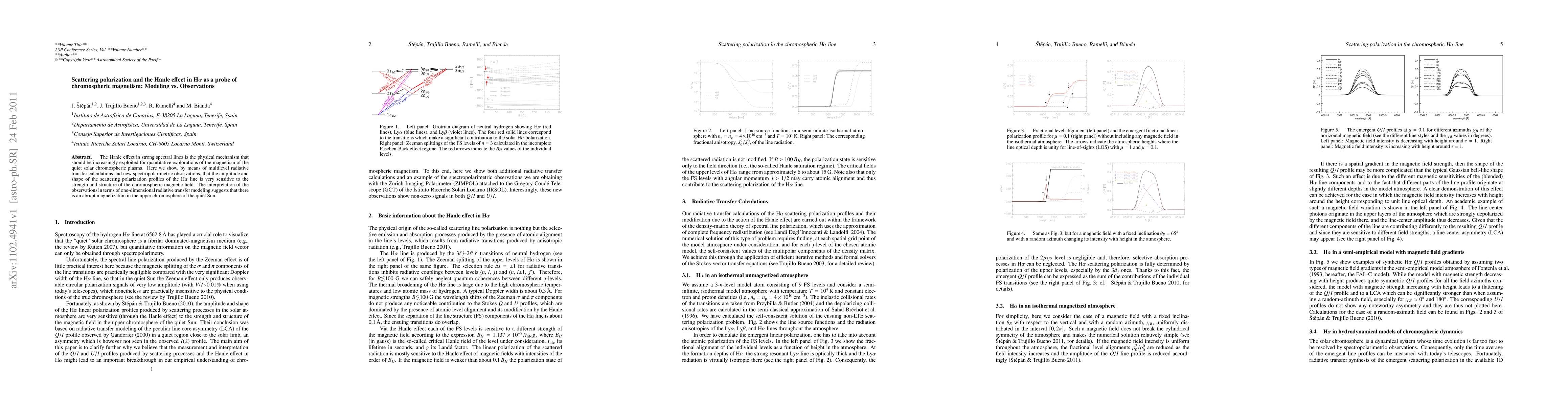This study combines radiative transfer modeling and spectropolarimetric observations to investigate the Hanle effect in the H-alpha line, revealing that its scattering polarization is highly sensitive to the chromospheric magnetic field's strength and structure. The findings suggest an abrupt magnetization in the upper chromosphere of the quiet Sun.