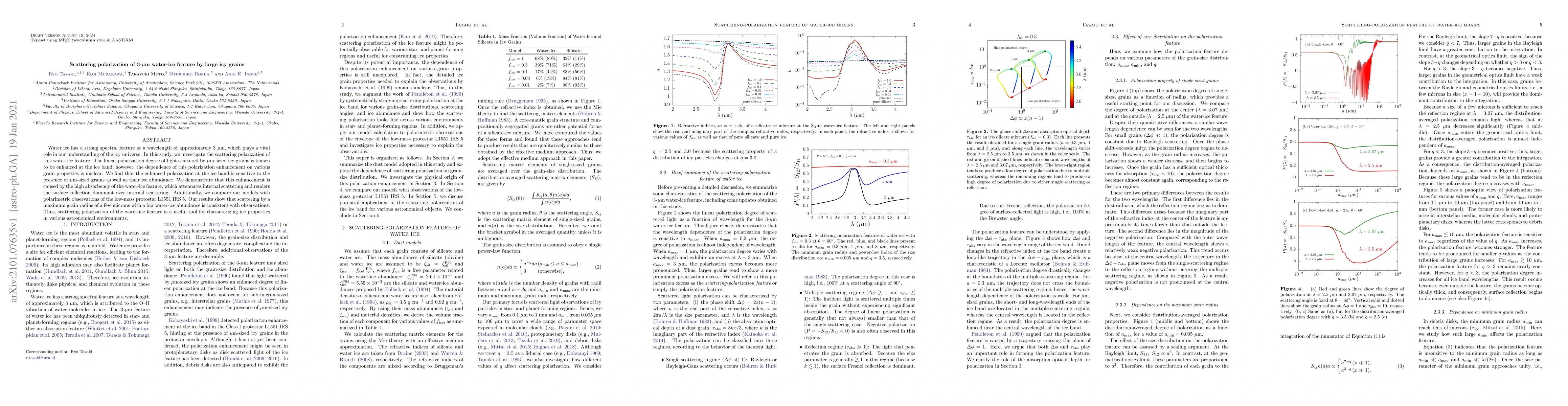 Water ice has a strong spectral feature at a wavelength of approximately $3~\mu$m, which plays a vital role in our understanding of the icy universe. In this study, we investigate the scattering polarization of this water-ice feature. The linear polarization degree of light scattered by $\mu$m-sized icy grains is known to be enhanced at the ice band; however, the dependence of this polarization enhancement on various grain properties is unclear. We find that the enhanced polarization at the ice band is sensitive to the presence of $\mu$m-sized grains as well as their ice abundance. We demonstrate that this enhancement is caused by the high absorbency of the water-ice feature, which attenuates internal scattering and renders the surface reflection dominant over internal scattering. Additionally, we compare our models with polarimetric observations of the low-mass protostar L1551 IRS 5. Our results show that scattering by a maximum grain radius of a few microns with a low water-ice abundance is consistent with observations. Thus, scattering polarization of the water-ice feature is a useful tool for characterizing ice properties in various astronomical environments.