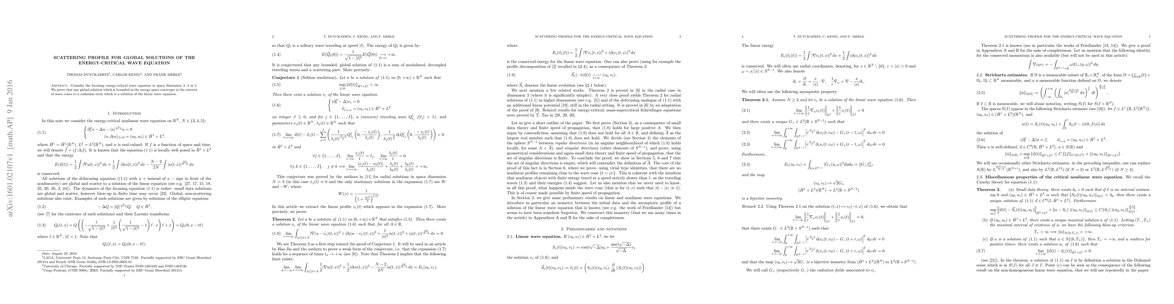 A recent study proves that global solutions to a specific type of wave equation converge to a radiation term in space dimensions 3-5, indicating the formation of waves outside of certain cones in space.