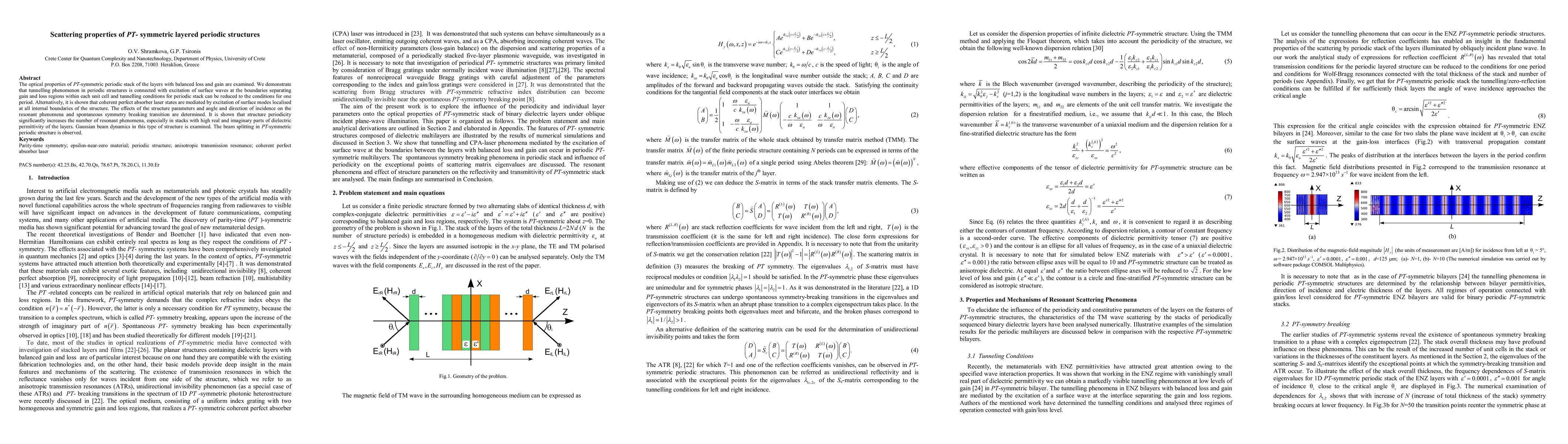 This paper investigates the optical scattering properties of PT-symmetric layered periodic structures, demonstrating that tunnelling and coherent perfect absorption are linked to surface wave excitations at internal boundaries. The study highlights the significant impact of structure periodicity and incidence parameters on resonant phenomena and spontaneous symmetry breaking.