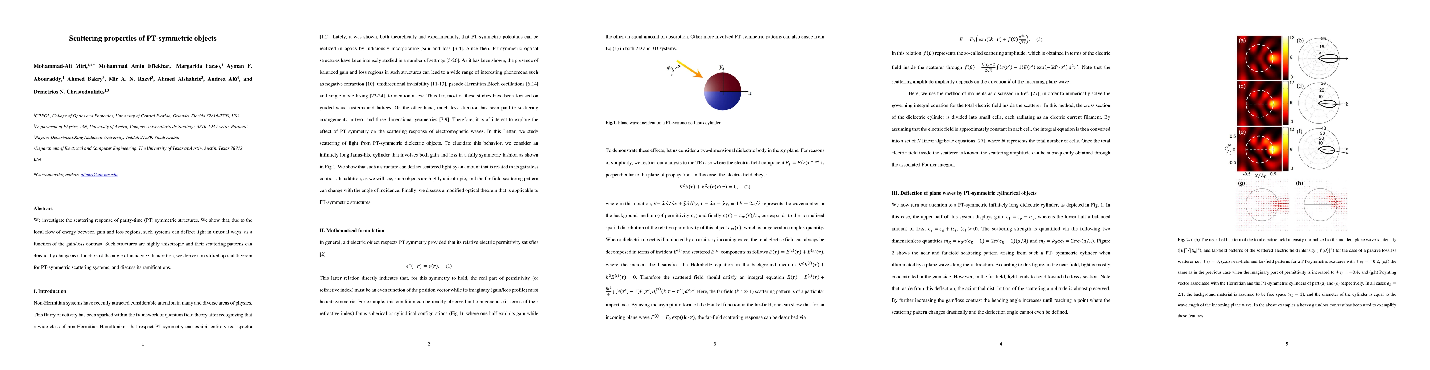 The research investigates scattering properties of PT-symmetric structures through numerical simulations, analyzing near-field and far-field patterns, and deriving a modified optical theorem for PT-symmetric scattering systems.