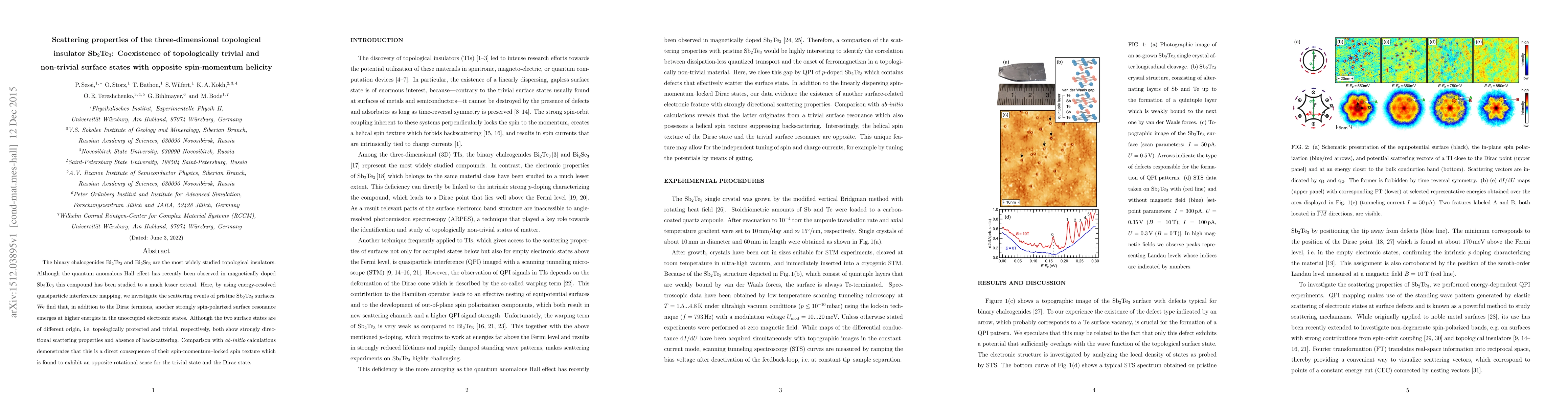This study investigates scattering properties in Sb2Te3, revealing both topologically protected and trivial surface states with opposite spin-momentum helicity. The research identifies distinct scattering behaviors for these states due to their differing origins and spin textures.