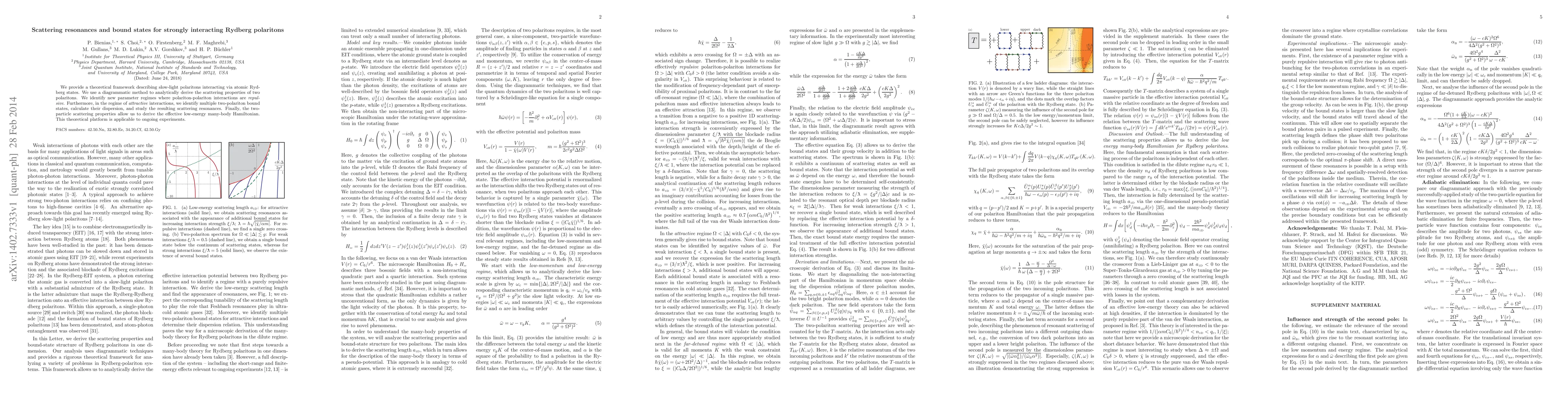 We provide a theoretical framework describing slow-light polaritons interacting via atomic Rydberg states. We use a diagrammatic method to analytically derive the scattering properties of two polaritons. We identify parameter regimes where polariton-polariton interactions are repulsive. Furthermore, in the regime of attractive interactions, we identify multiple two-polariton bound states, calculate their dispersion, and study the resulting scattering resonances. Finally, the two-particle scattering properties allow us to derive the effective low-energy many-body Hamiltonian. This theoretical platform is applicable to ongoing experiments.