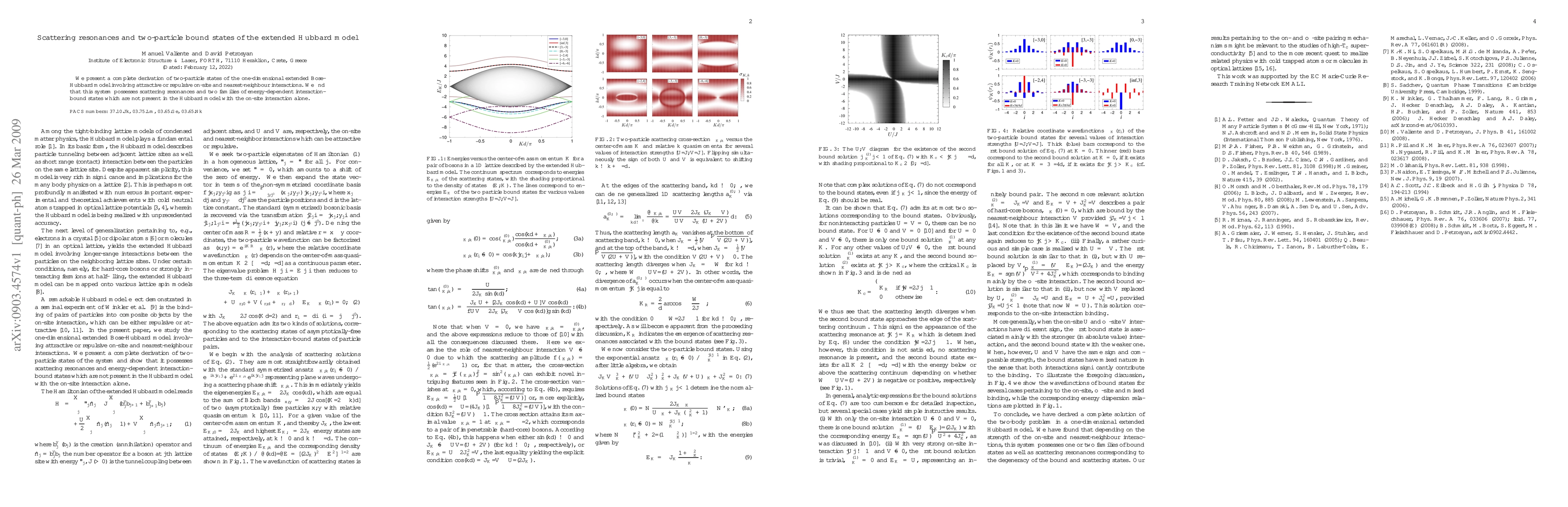 Summary: The research derives two-particle states in the one-dimensional extended Hubbard model, revealing scattering resonances and two families of energy-dependent interaction-bound states, distinct from the simpler Hubbard model with only on-site interactions.