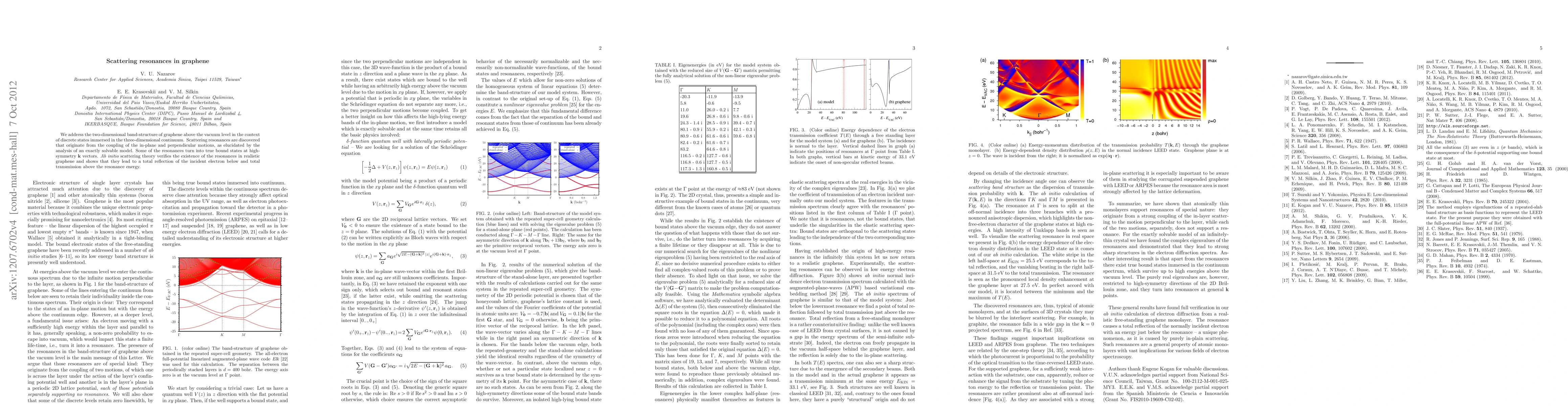 This study identifies scattering resonances in graphene arising from the coupling of in-plane and perpendicular motions, verified through both an exactly solvable model and ab initio scattering theory. These resonances transform into bound states at specific high-symmetry points, resulting in total electron reflection below resonance energy and total transmission above it.