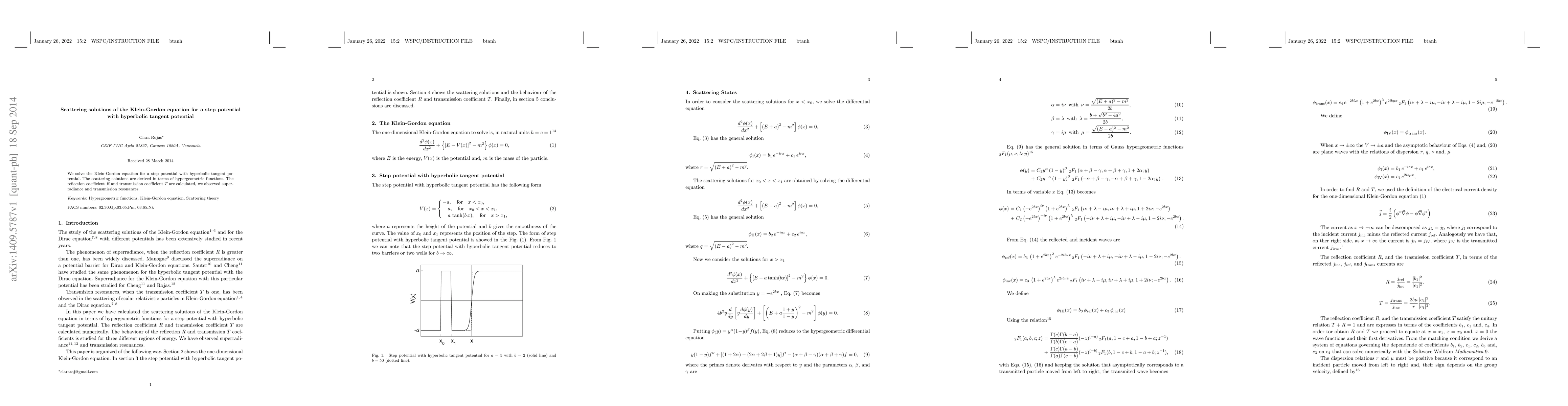 This paper derives scattering solutions for the Klein-Gordon equation in a step potential with hyperbolic tangent potential, utilizing hypergeometric functions. The study calculates reflection and transmission coefficients, revealing superradiance and transmission resonances.