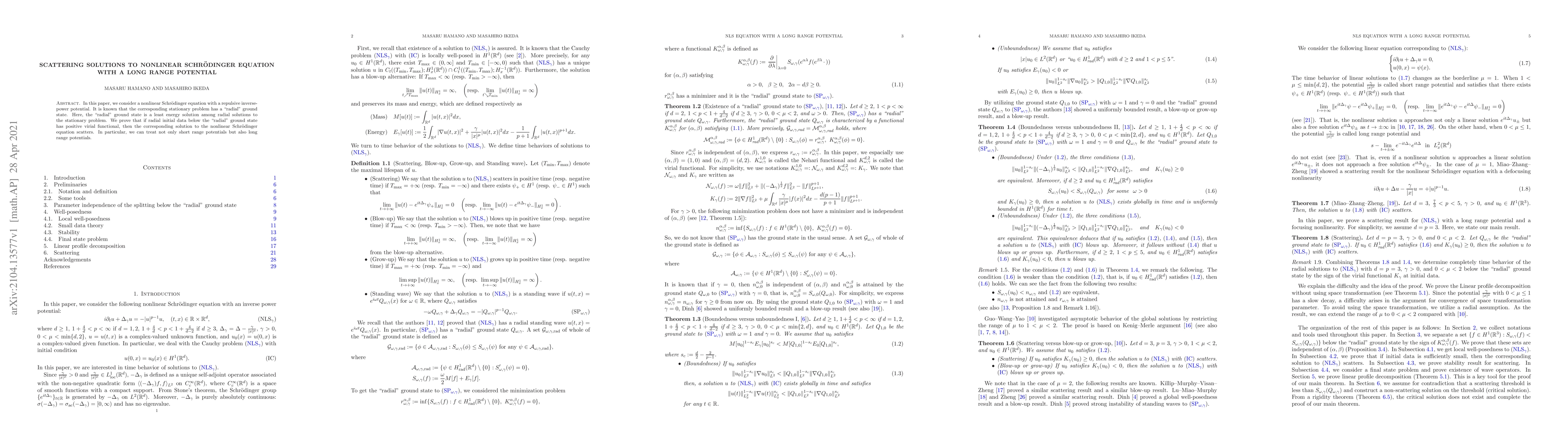This paper investigates scattering solutions for a nonlinear Schrödinger equation with a repulsive inverse-power potential. It proves that if radial initial data below the "radial" ground state has a positive virial functional, the solution scatters, applicable to both short and long range potentials.