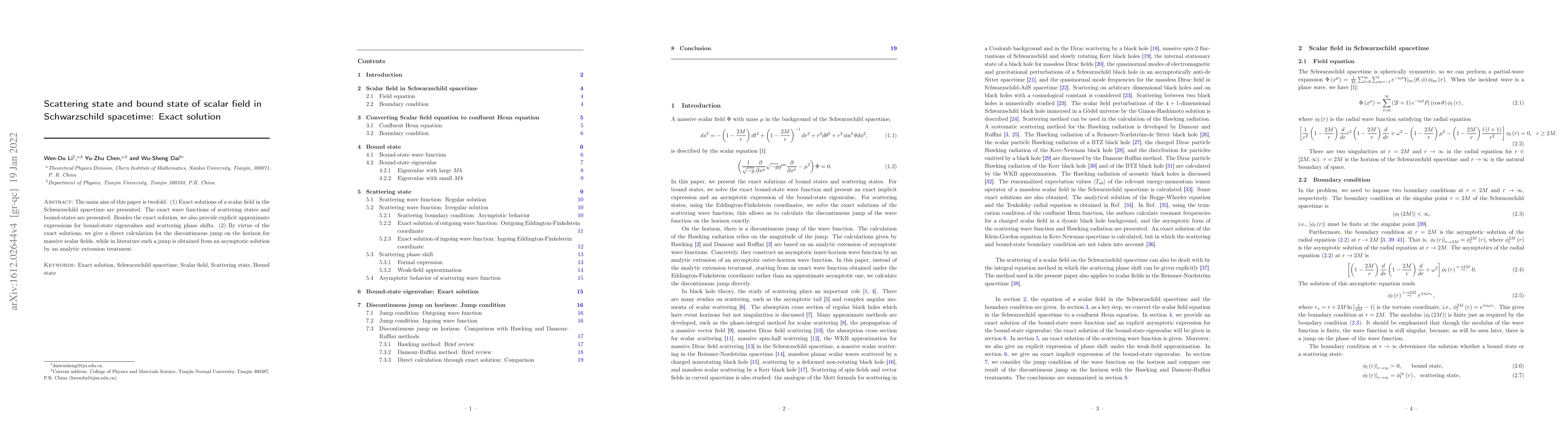 This paper presents exact solutions for scalar fields in Schwarzschild spacetime, including wave functions for scattering states and bound states, and calculates the discontinuous jump on the horizon for massive scalar fields.