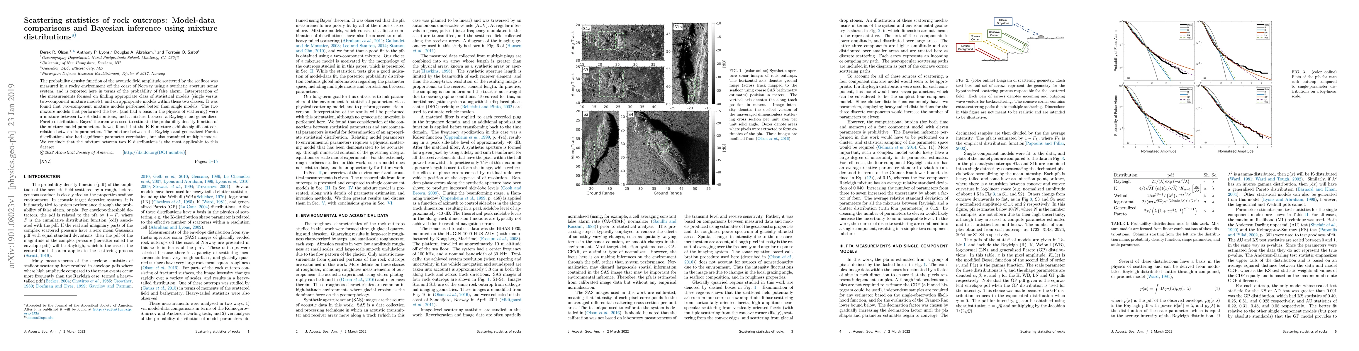 The probability density function of the acoustic field amplitude scattered by the seafloor was measured in a rocky environment off the coast of Norway using a synthetic aperture sonar system, and is reported here in terms of the probability of false alarm. Interpretation of the measurements focused on finding appropriate class of statistical models (single versus two-component mixture models), and on appropriate models within these two classes. It was found that two-component mixture models performed better than single models. The two mixture models that performed the best (and had a basis in the physics of scattering) were a mixture between two K distributions, and a mixture between a Rayleigh and generalized Pareto distribution. Bayes' theorem was used to estimate the probability density function of the mixture model parameters. It was found that the K-K mixture exhibits significant correlation between its parameters. The mixture between the Rayleigh and generalized Pareto distributions also had significant parameter correlation, but also contained multiple modes. We conclude that the mixture between two K distributions is the most applicable to this dataset.