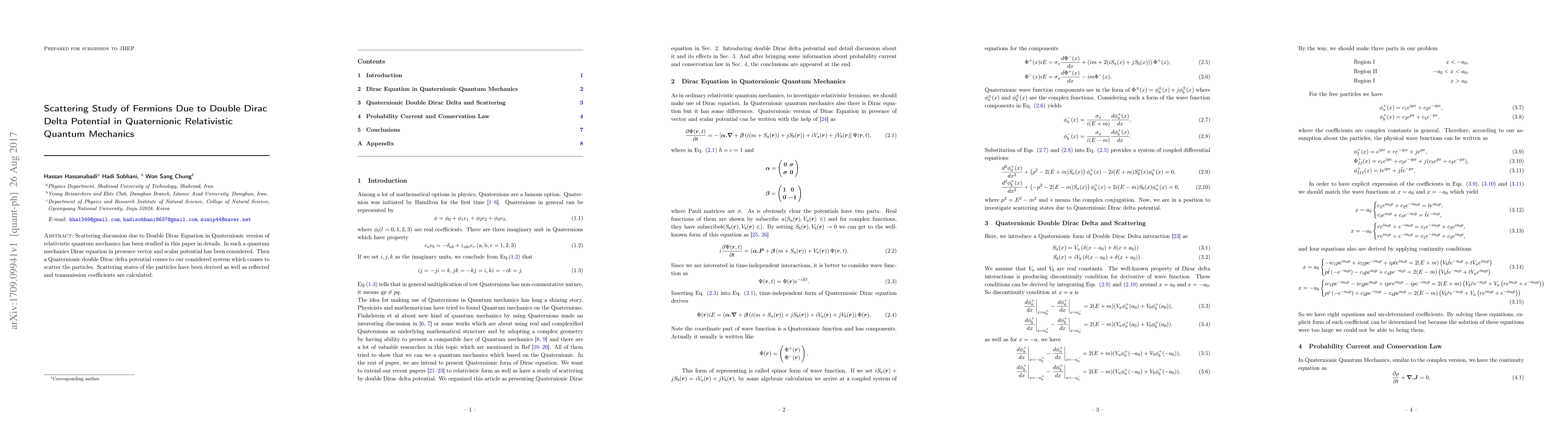 This paper investigates the scattering of fermions in quaternionic relativistic quantum mechanics due to a double Dirac delta potential. It derives scattering states and calculates the reflected and transmission coefficients for particles experiencing this potential.