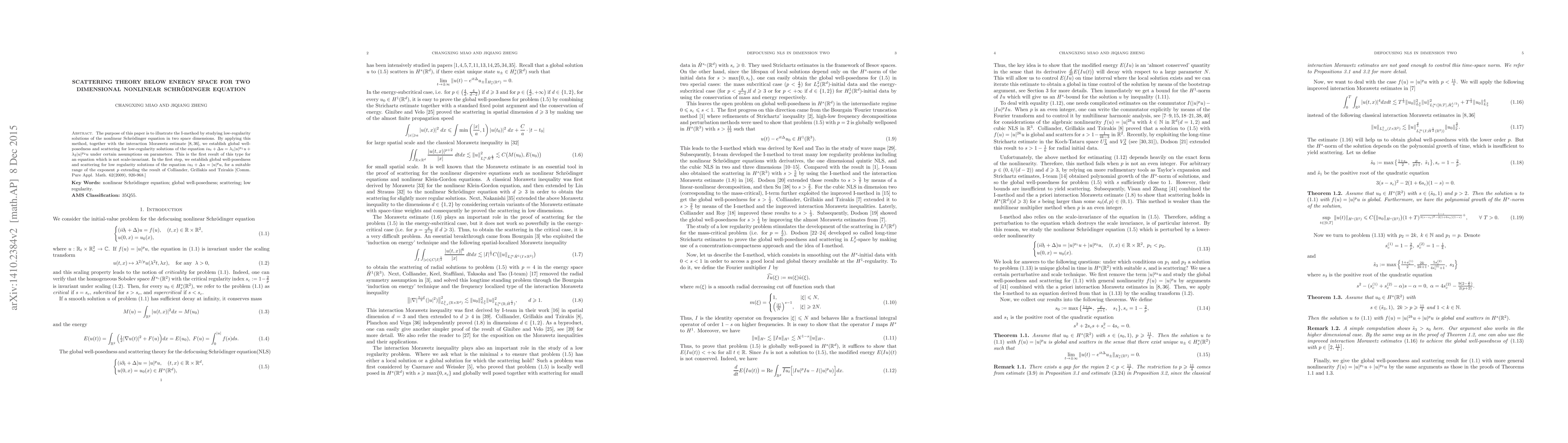 The purpose of this paper is to illustrate the I-method by studying low-regularity solutions of the nonlinear Schr\'[o]dinger equation in two space dimensions. By applying this method, together with the interaction Morawetz estimate, (see [J. Colliander, M. Grillakis and N. Tzirakis, Tensor products and correlation estimates with applications to nonlinear Schr\"{o}dinger equations, Commun. Pure Appl. Math. 62(2009)920-968; F. Planchon and L. Vega, Bilinear virial identities and applications, Ann. Sci. Ecole Norm. Sup. 42(2009)261-290]), establish global well-posedness and scattering for low-regularity solutions of the equation $iu_t + \Delta u = \lambda _1|u|^{p_1} u + \lambda _2|u|^{p_2} u$ under certain assumptions on parameters. This is the first result of this type for an equation which is not scale-invariant. In the first step, we establish global well-posedness and scattering for low regularity solutions of the equation $iu_t + \Delta u = |u|^p u$, for a suitable range of the exponent $p$ extending the result of Colliander, Grillakis and Tzirakis [Commun. Pure Appl. Math. 62(2009)920-968].