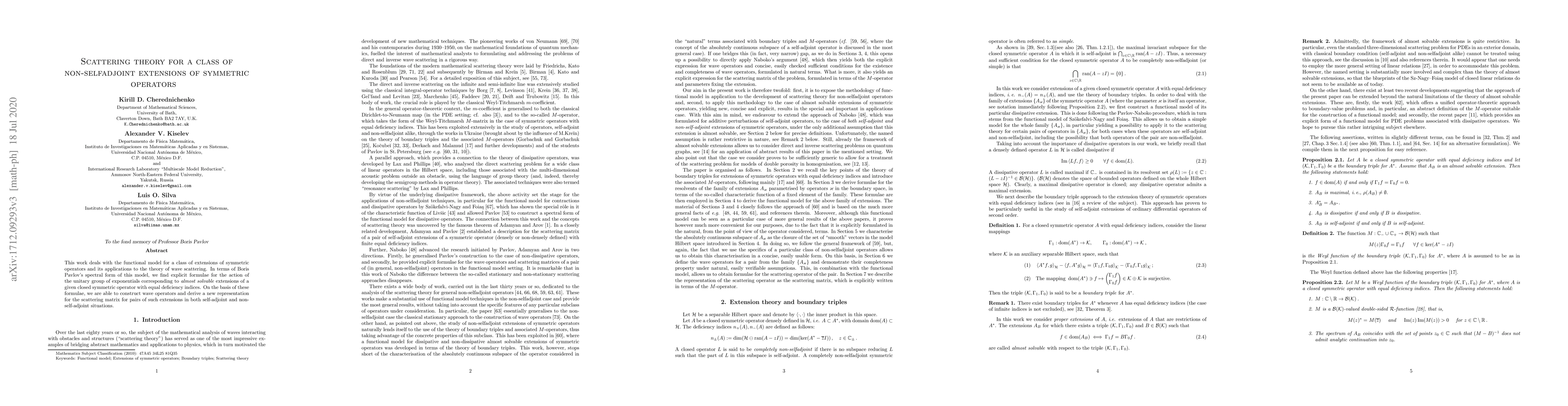 This work deals with the functional model for a class of extensions of symmetric operators and its applications to the theory of wave scattering. In terms of Boris Pavlov's spectral form of this model, we find explicit formulae for the action of the unitary group of exponentials corresponding to almost solvable extensions of a given closed symmetric operator with equal deficiency indices. On the basis of these formulae, we are able to construct wave operators and derive a new representation for the scattering matrix for pairs of such extensions in both self-adjoint and non-self-adjoint situations.