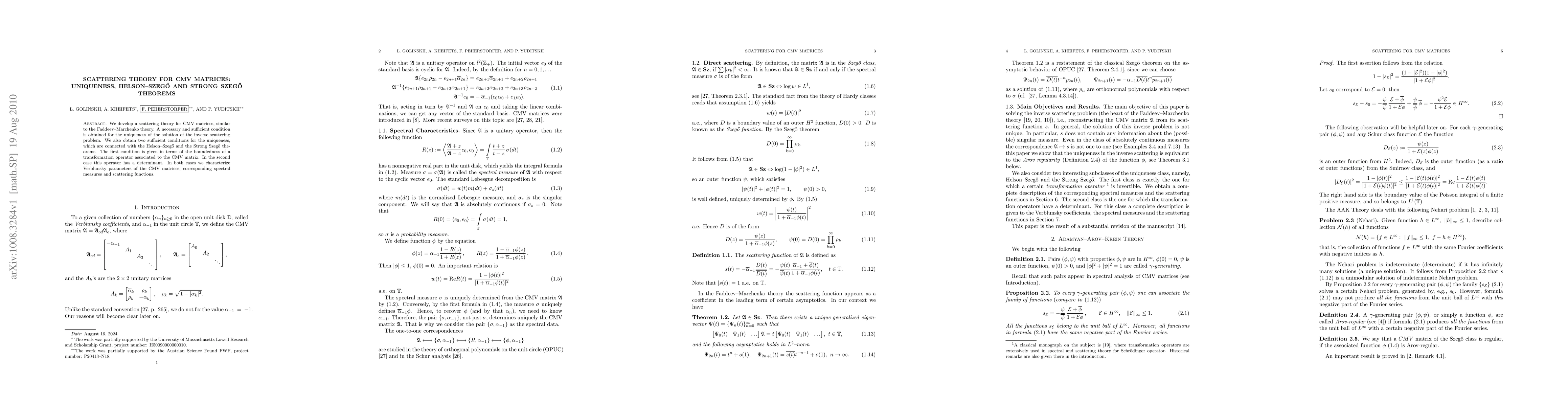The development of a scattering theory framework for CMV matrices, including conditions for uniqueness and connections to Helson-Szegő and Strong Szegő theorems.