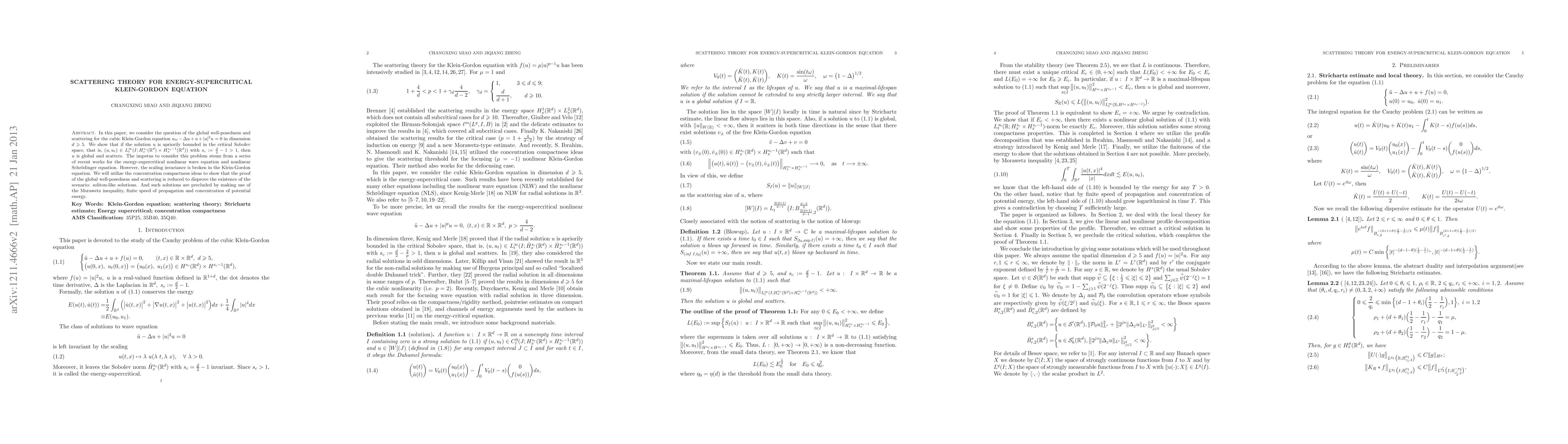 In this paper, we consider the question of the global well-posedness and scattering for the cubic Klein-Gordon equation $u_{tt}-\Delta u+u+|u|^2u=0$ in dimension $d\geq5$. We show that if the solution $u$ is apriorily bounded in the critical Sobolev space, that is, $(u, u_t)\in L_t^\infty(I; H^{s_c}_x(\R^d)\times H_x^{s_c-1}(\R^d))$ with $s_c:=\frac{d}2-1>1$, then $u$ is global and scatters. The impetus to consider this problem stems from a series of recent works for the energy-supercritical nonlinear wave equation and nonlinear Schr\"odinger equation. However, the scaling invariance is broken in the Klein-Gordon equation. We will utilize the concentration compactness ideas to show that the proof of the global well-posedness and scattering is reduced to disprove the existence of the scenario: soliton-like solutions. And such solutions are precluded by making use of the Morawetz inequality, finite speed of propagation and concentration of potential energy.